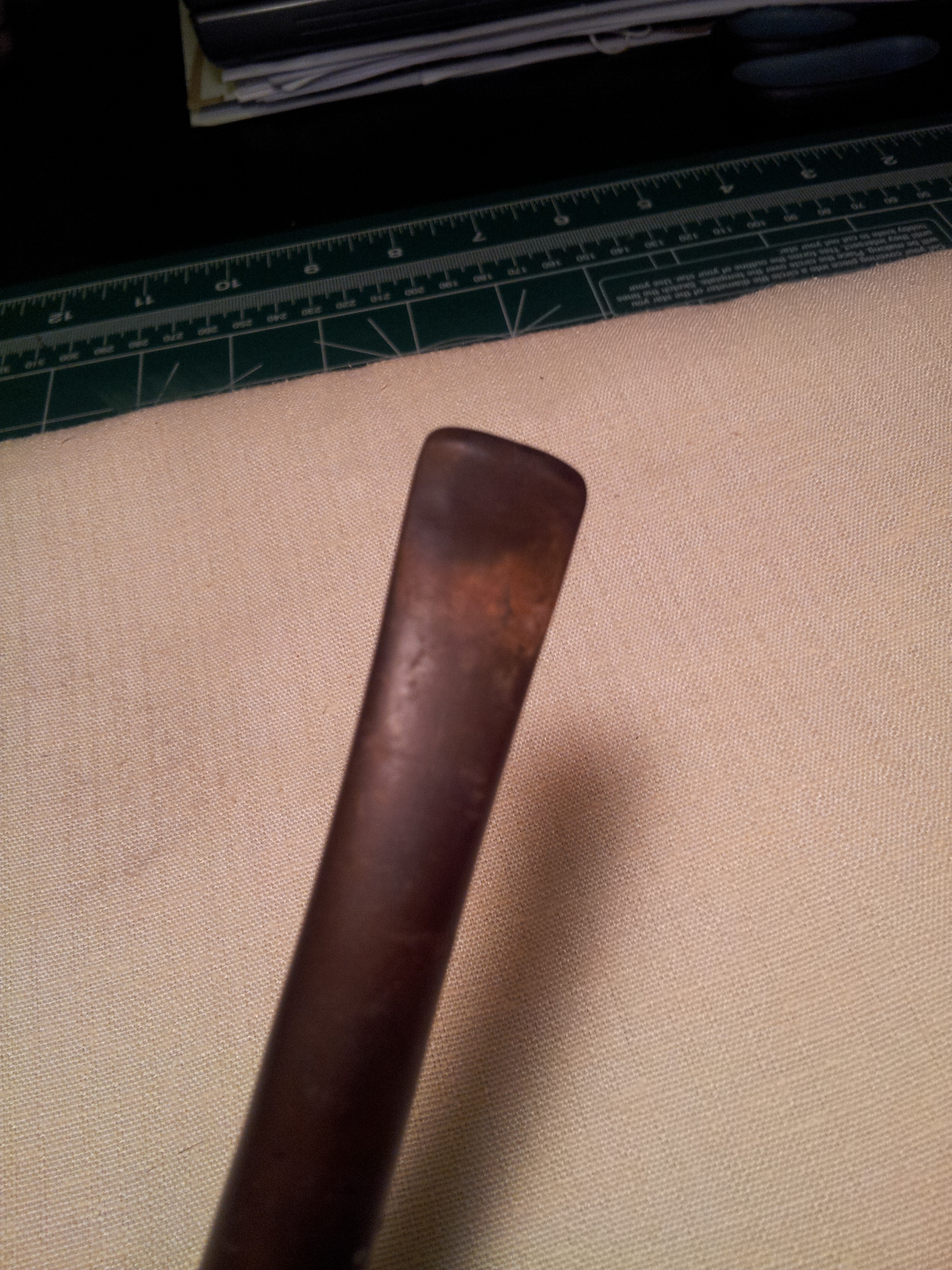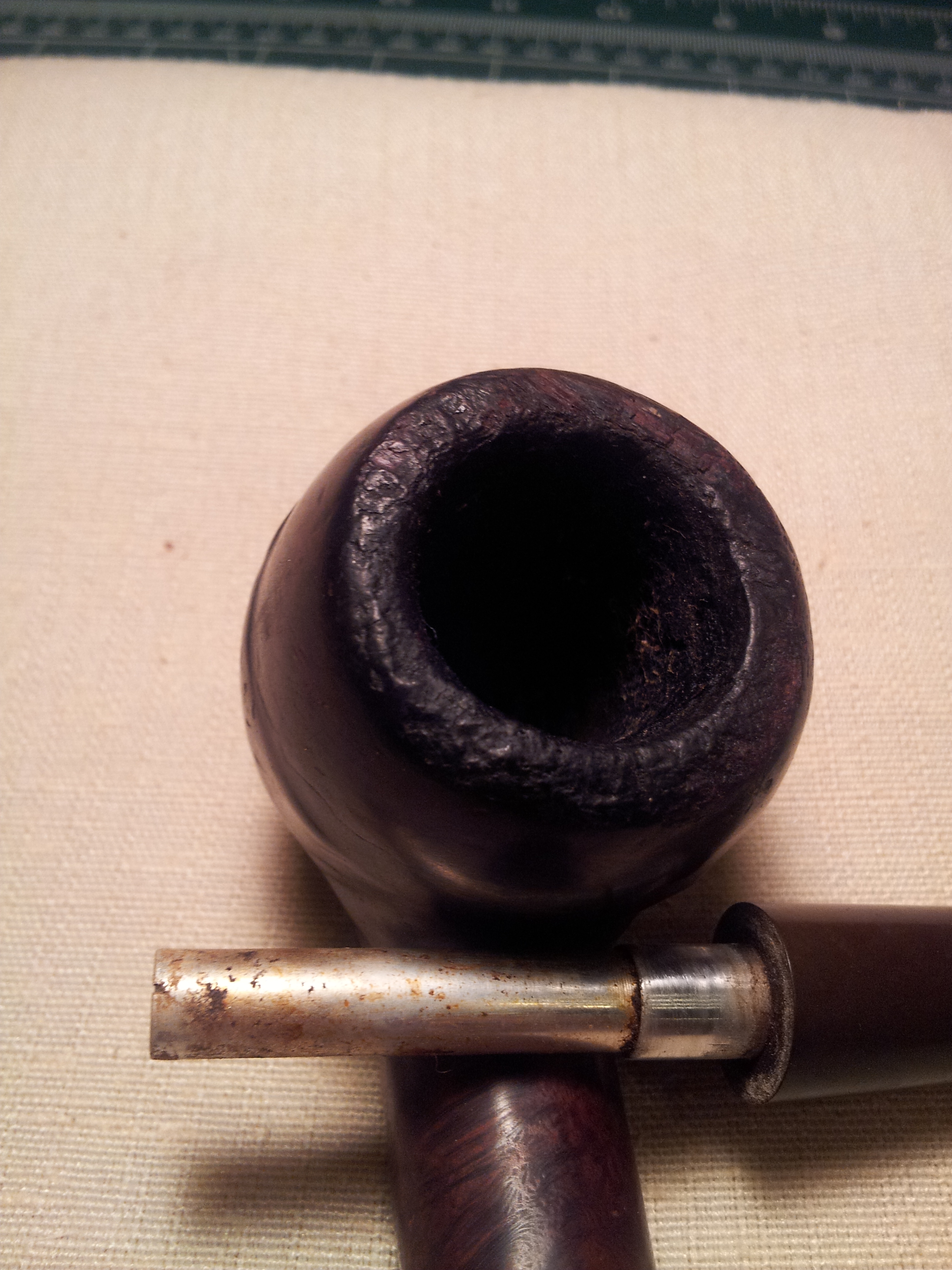 The pipe as purchased was in a sorry state. The previous owner obviously loved the pipe – it was well used – but by the same token obviously didn’t care about preserving the pipe. It was clearly the original owner’s habit to knock the dottle out of the pipe by bashing the rim against whatever object happened to be nearby – a brick wall? Concrete curb? Steel fence? In any case, most of the front right rim was significantly worn away and what remained looked like it had been on the receiving end of a buckshot round.