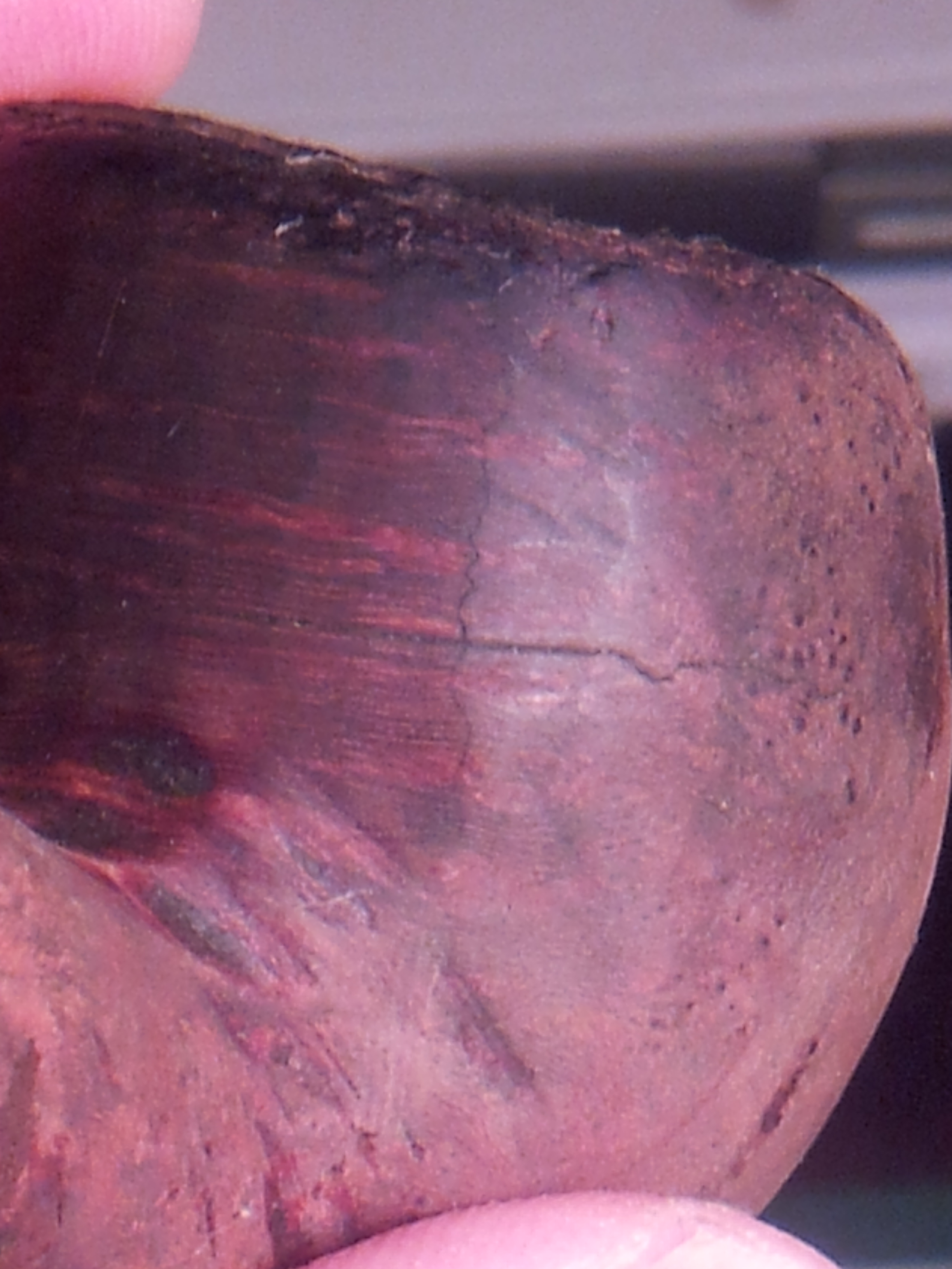 My course of action now was twofold: first to top the bowl to correct the rim, and also to stabilize the cracks in the bowl. The rim was corrected by topping the bowl – gradually working the rim flat against some 220 grit sandpaper on a flat level surface (I used the deck of my table saw). I worked slowly, checking my progress often in order to ensure a rim parallel to the line carved around the bowl by the Brigham craftsman years ago.