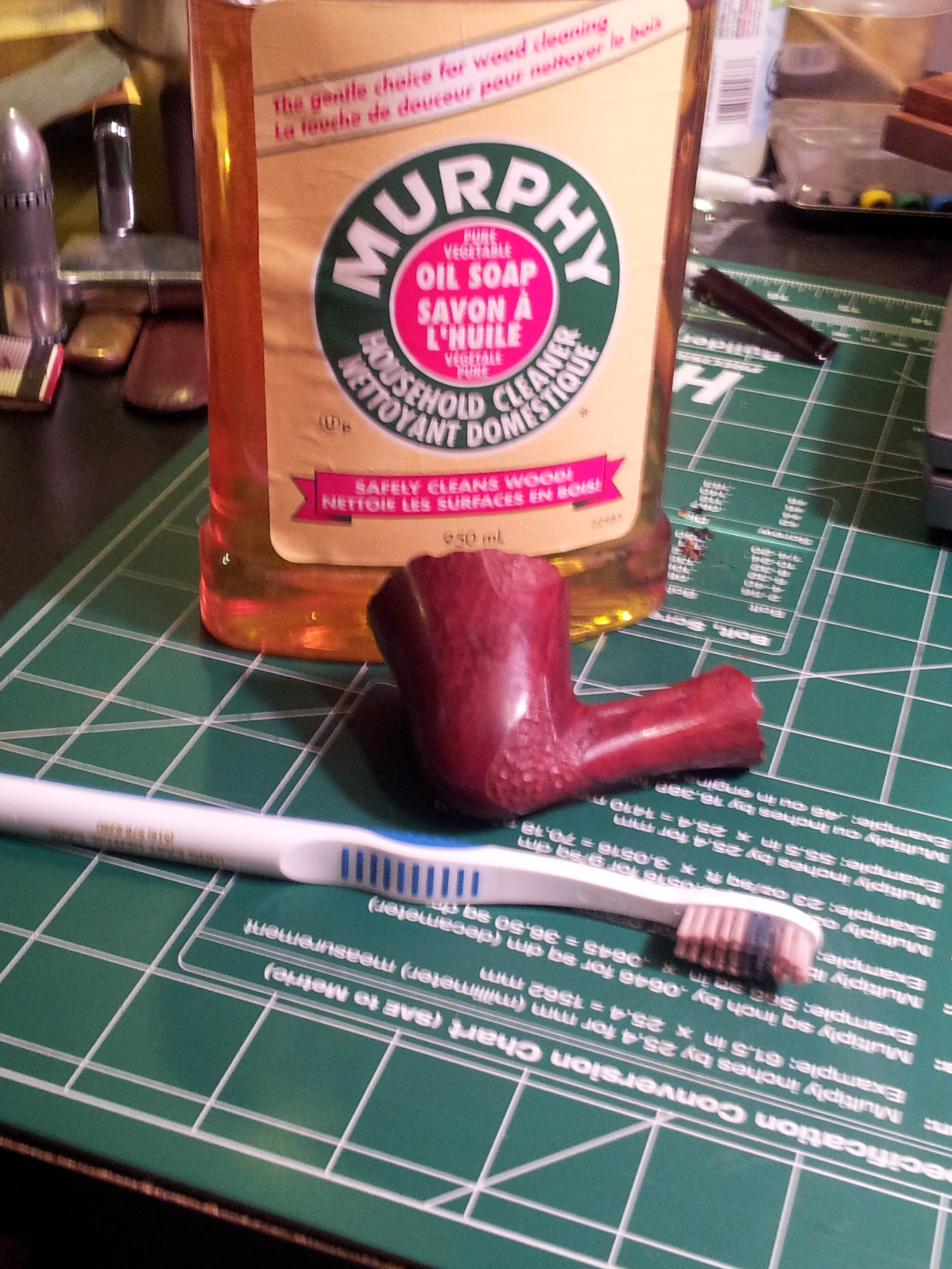 I dropped the stem into an Oxyclean bath to soak and soften the accumulated grime and oxidation while I worked on the stummel . I decided to clean the entire outside of the pipe, and especially the rim, with Murphy’s Oil Soap and a soft toothbrush. This works very well at getting the gunk off the surface, including all the little hills and valleys of rusticated briar.