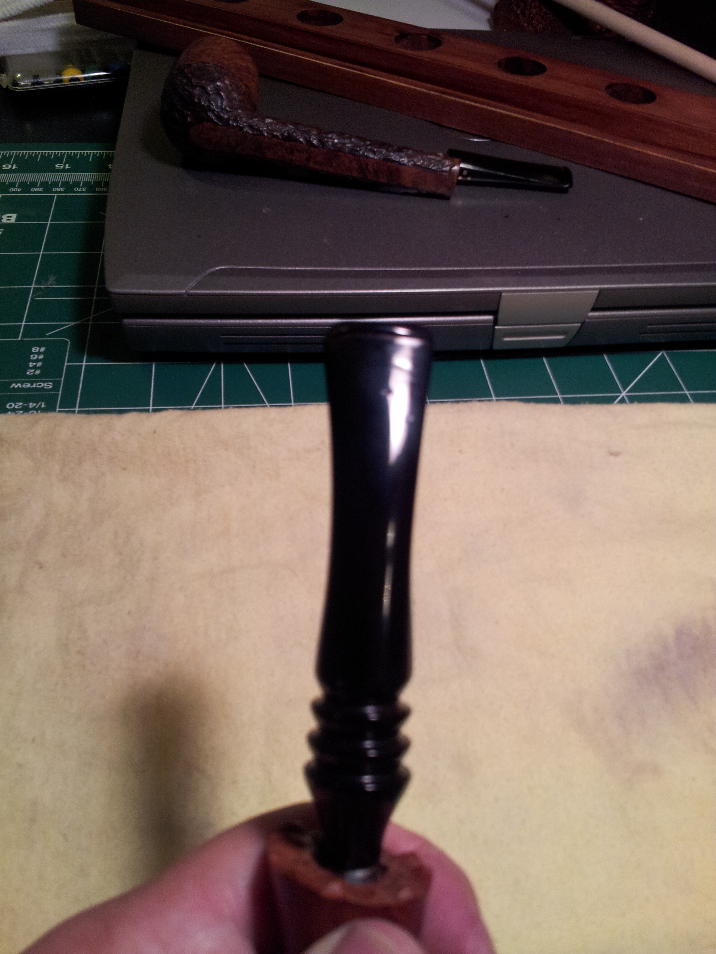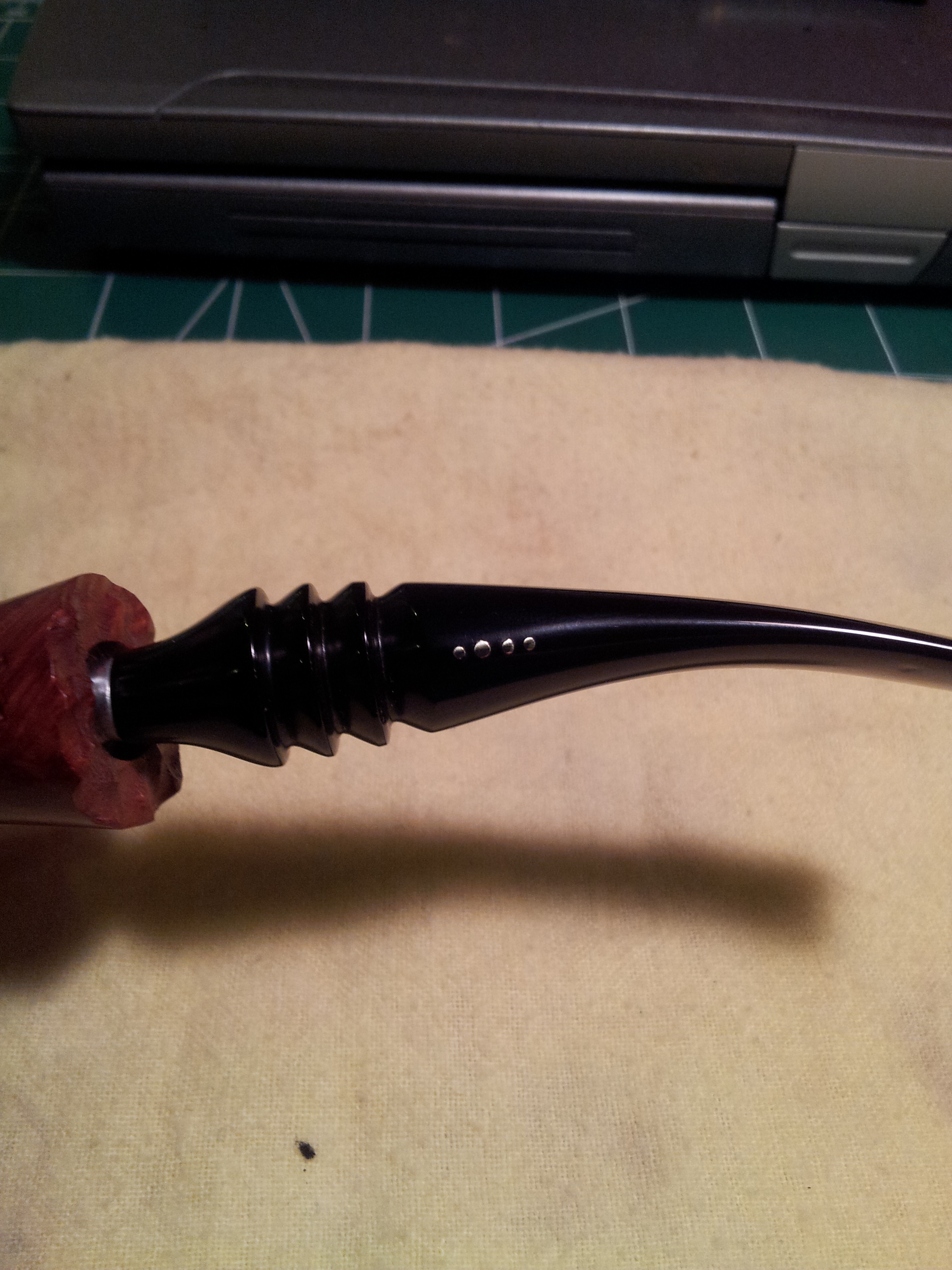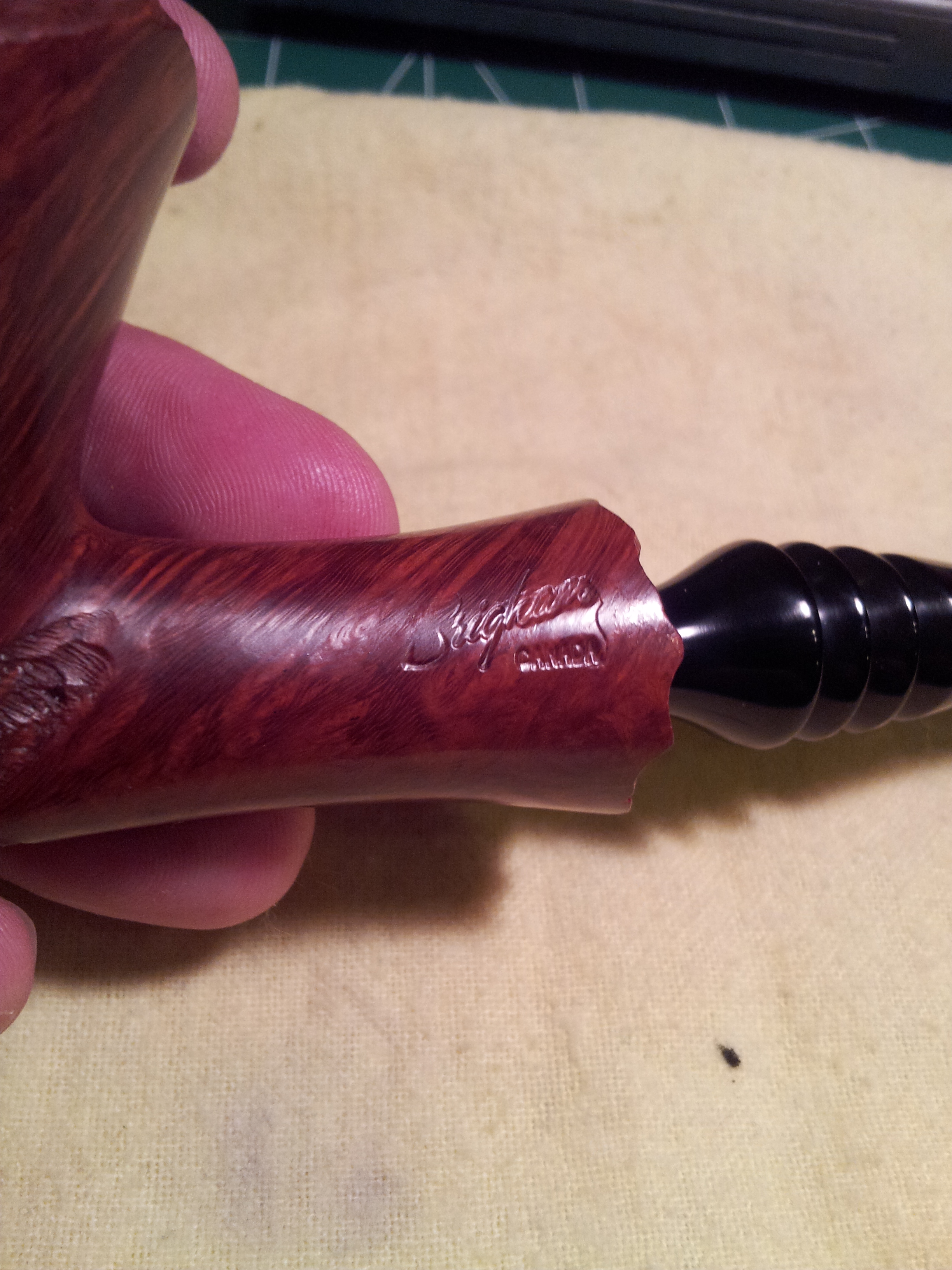 This risk factor, I think, affected the bids and I came away the winner at only $40CAD. But would the gamble pay off? In due time, a pipe-shaped package arrived at my door. I eagerly opened it up and had a good look at the pipe for the first time. My eyes aren’t what they used to be but a quick wipe over the pertinent area of the stem revealed, much to my relief, a series of four horizontal dots, the second of which was noticeably larger than the others.