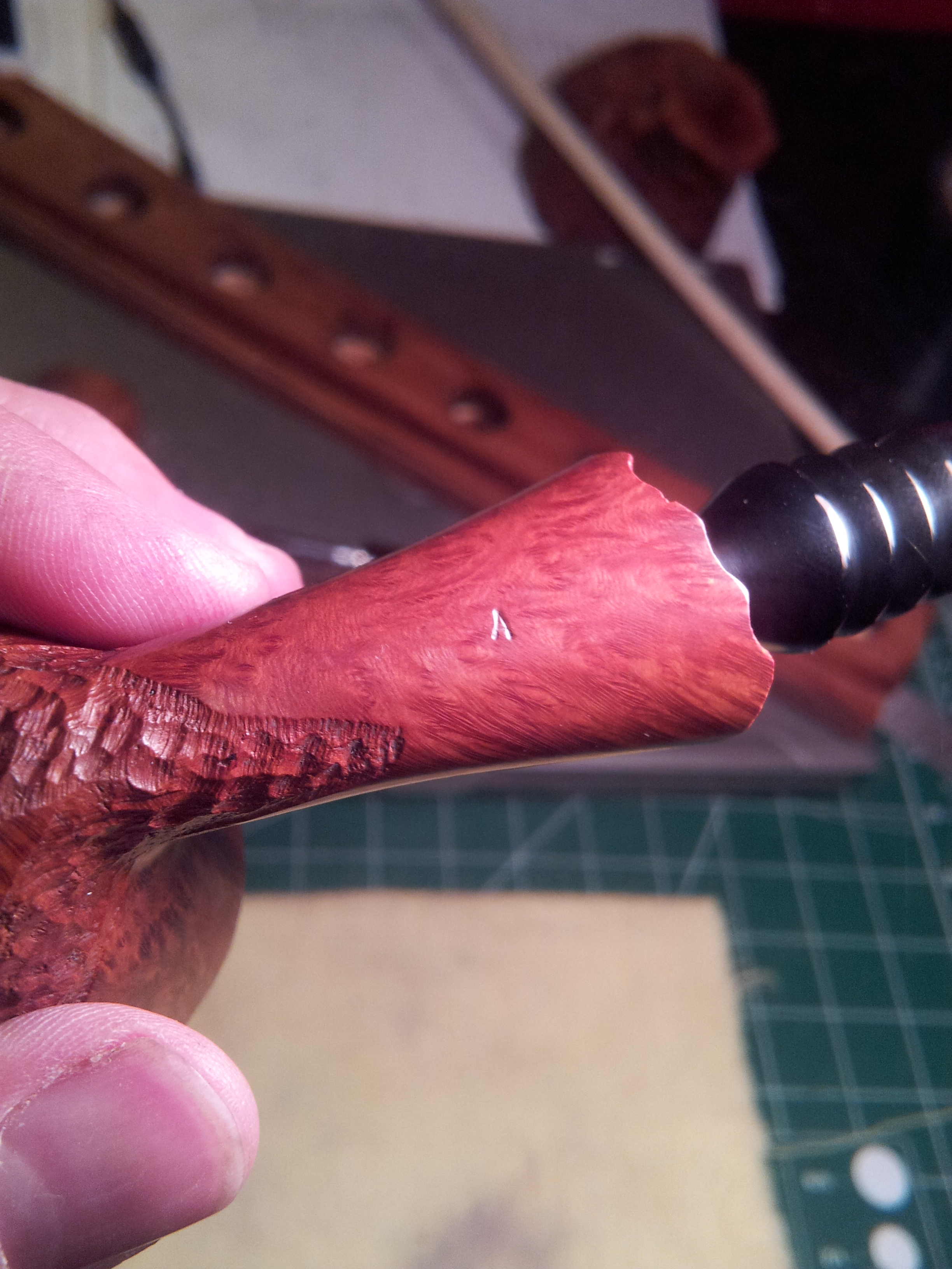 Now that the stummel was clean, it was easy to find all the marks, stampings and any flaws in the briar. In addition to the “Brigham” over “Canada” stamp on the shank, I discovered an “A” stamped into the bottom of the bowl.