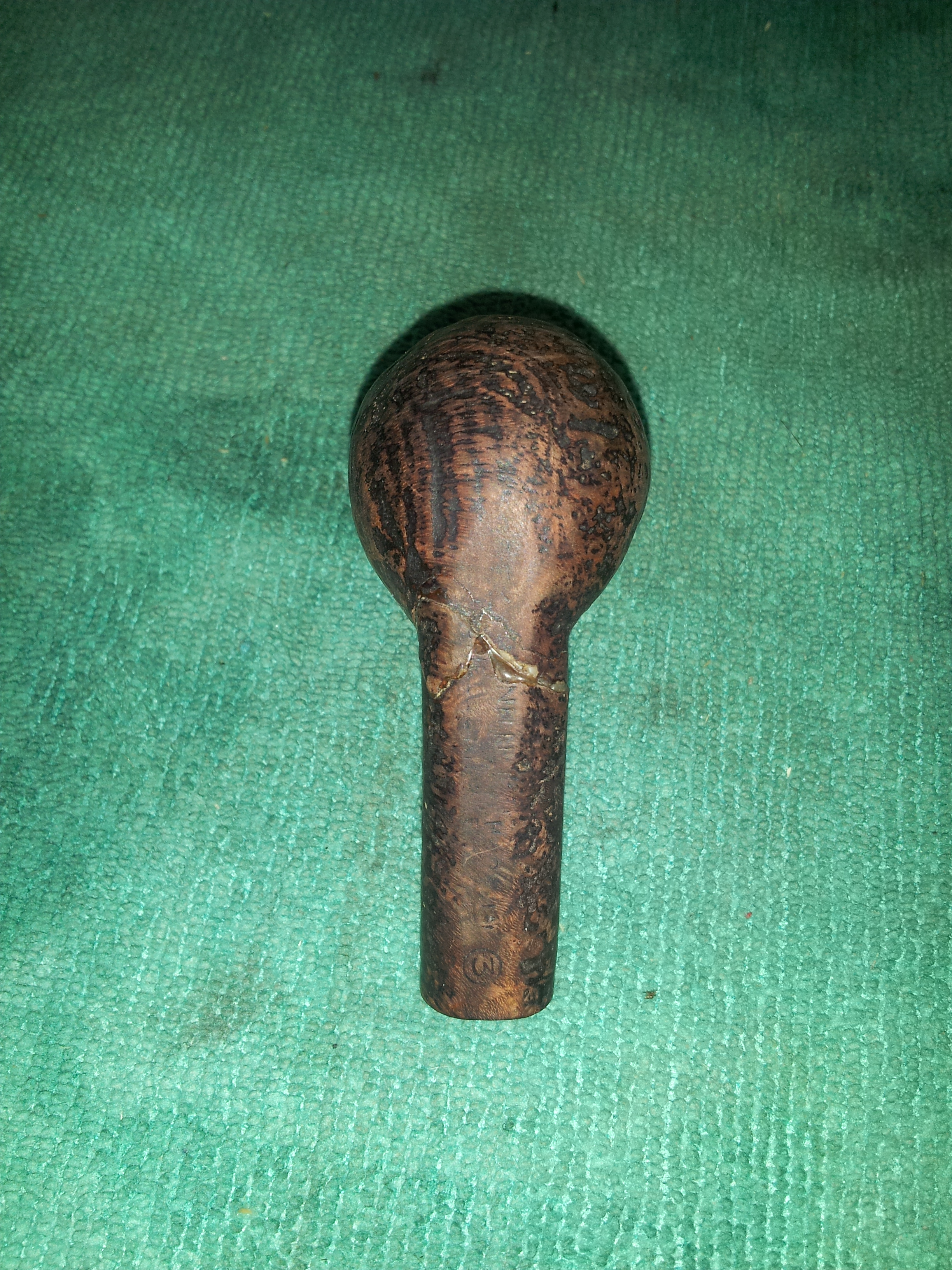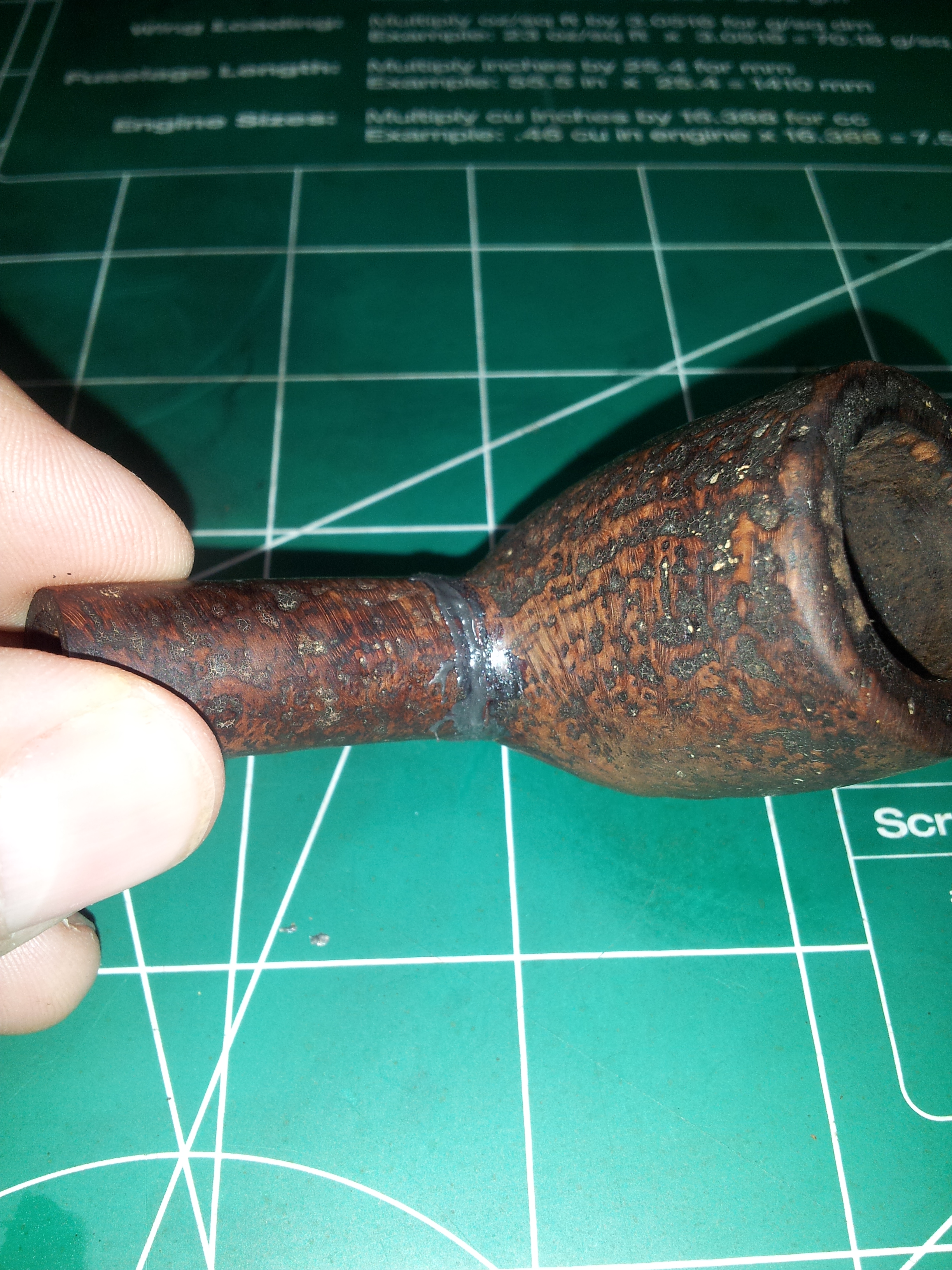 Here are a few pics of the stummel, the replacement stem having been removed and set aside. The whitish band of old glue is clearly visible. Also notice the bulge in the shank in the second pic, caused by misaligned pieces.