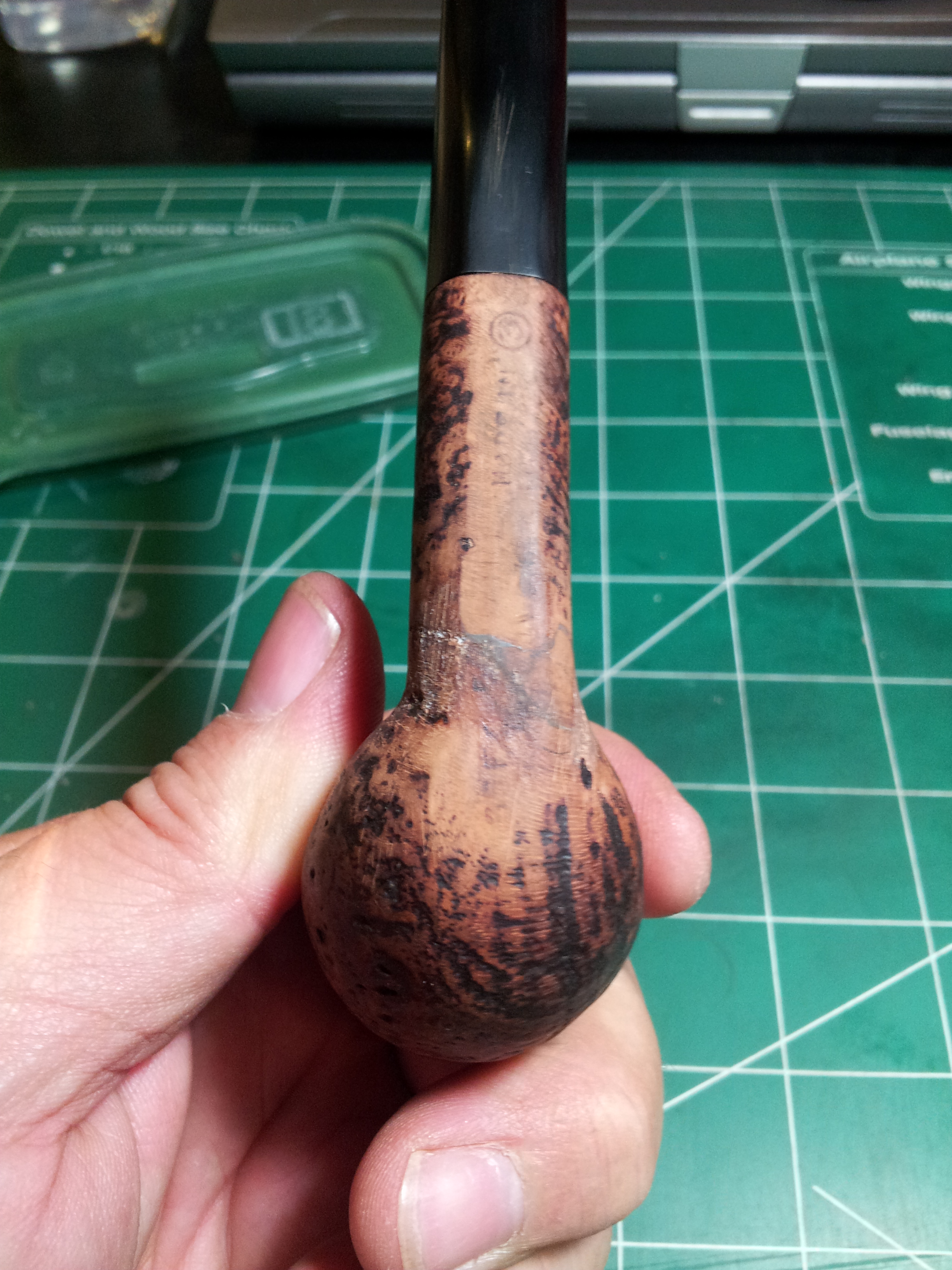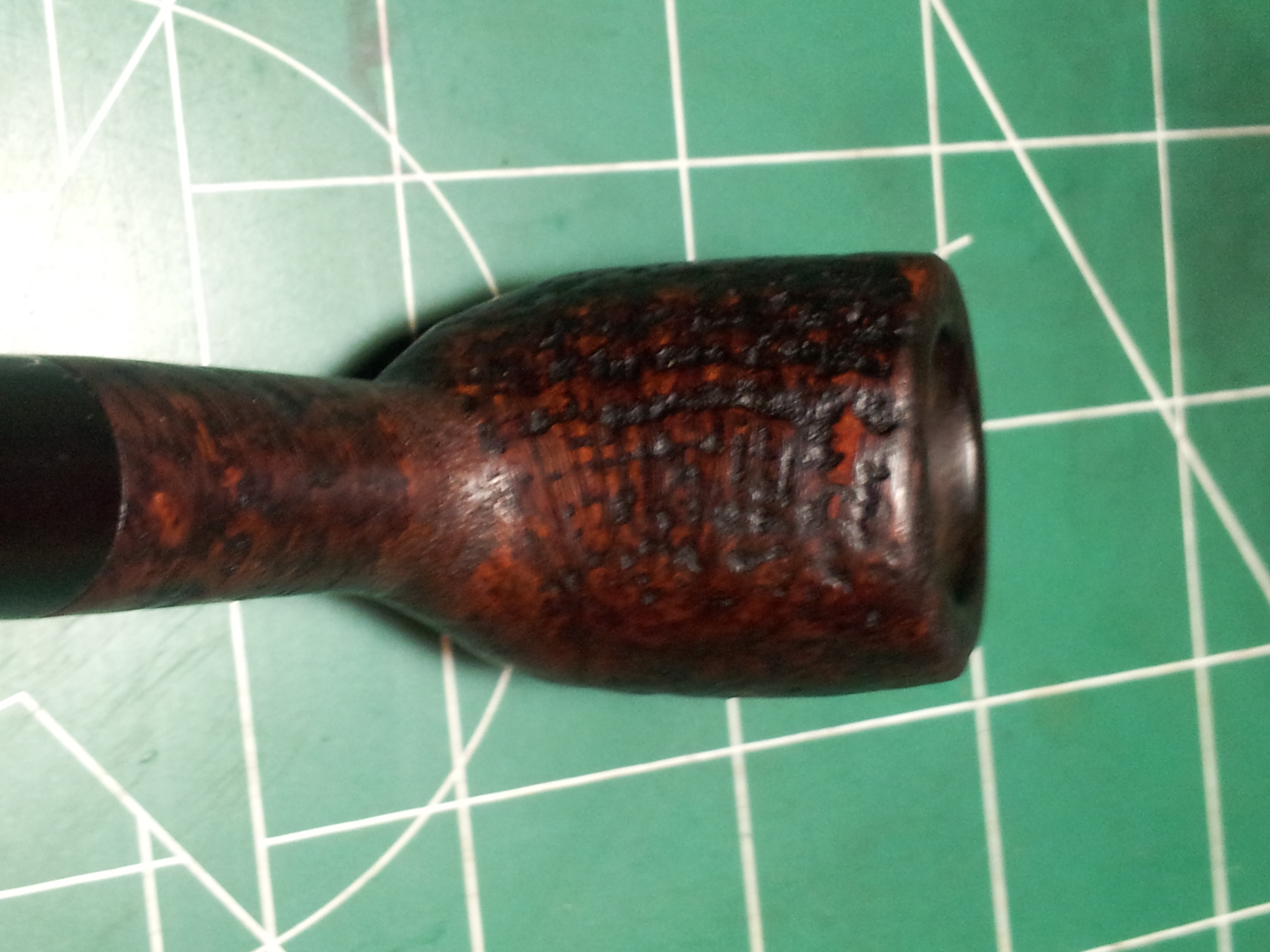 The factory stampings were not in good shape, as the break and subsequent repair ran through the middle of them, but there was enough left to readily identify the pipe as a Dunhill Shell Briar. After a bit of twisting and turning under a good light, I was able to read most of the stamping, and a bit of research online filled in the blanks: “39 (or perhaps 59) F/T” then “Dunhill” over “Shell Briar” followed by “Made in” over “England”, “3” (in a circle) and “S”.