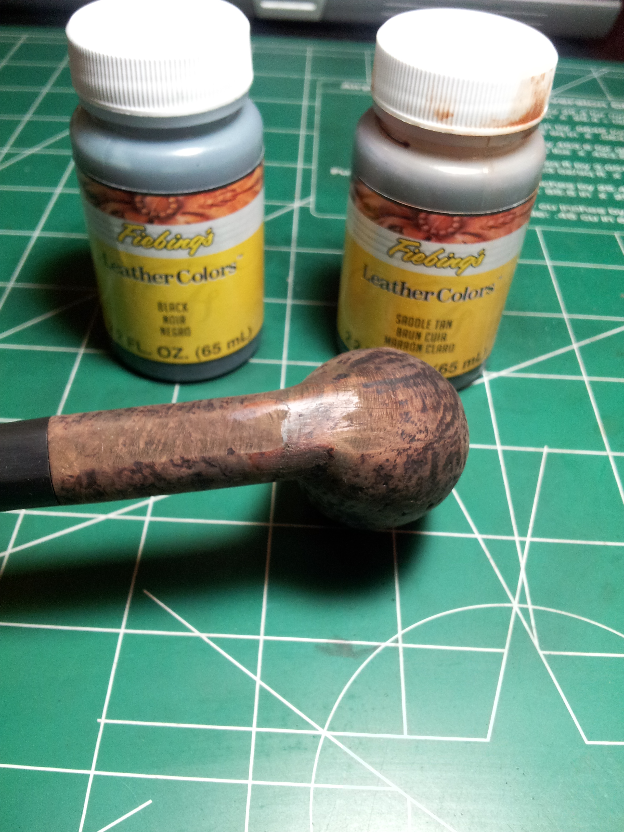 The Shell Briar finish is a multi-colour stain, with a reddish tone under a black/dark brown overcoat. The surface is then sanded away to reveal the red colour underneath. The rusticated finish of the briar means that the red shines through only on the high points, leaving the valleys of the rustication dark. To blend the repaired area into the pipe, I first applied a full-strength coat of Fiebing’s Saddle Tan leather dye (which is actually a brownish red) over the entire stummel, applying several heavier coats over the repair area. When dry, I applied a coat of Fiebing’s Black dye and let it dry too. A few minutes of scrubbing with 0000 steel wool took the black off the high spots and let the red shine through while still maintaining the overall dark finish of the pipe.