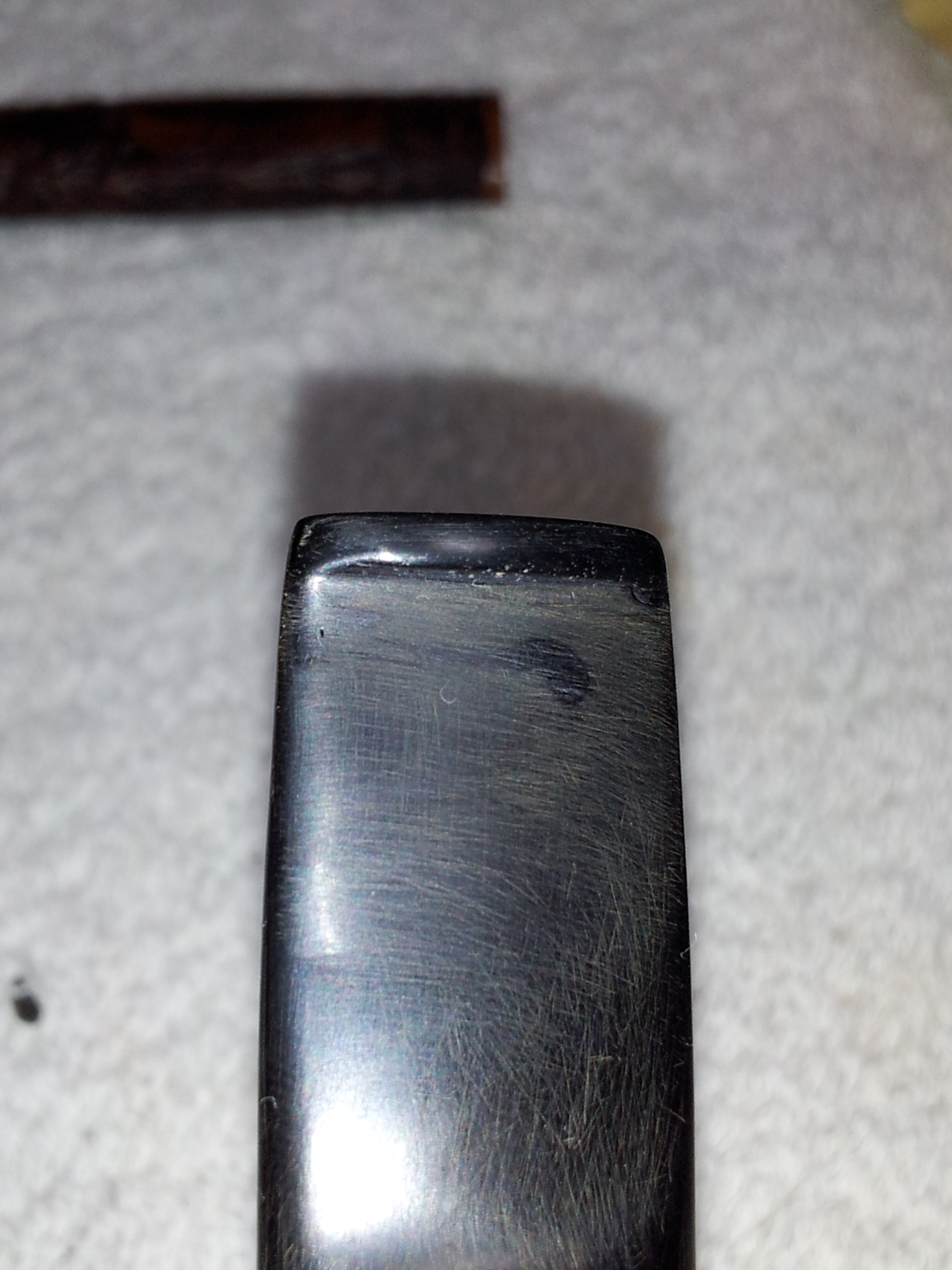 I sanded the button area with 220-grit paper then wiped it clean. I applied the CA glue/charcoal mix as evenly and as quickly as I could before it set. I applied several thin layers to build up the necessary depth of material top and bottom. After it cured, I used a series of files and sandpapers to shape and smooth the new button. This series of pics shows progress from rough shaping to finished button.