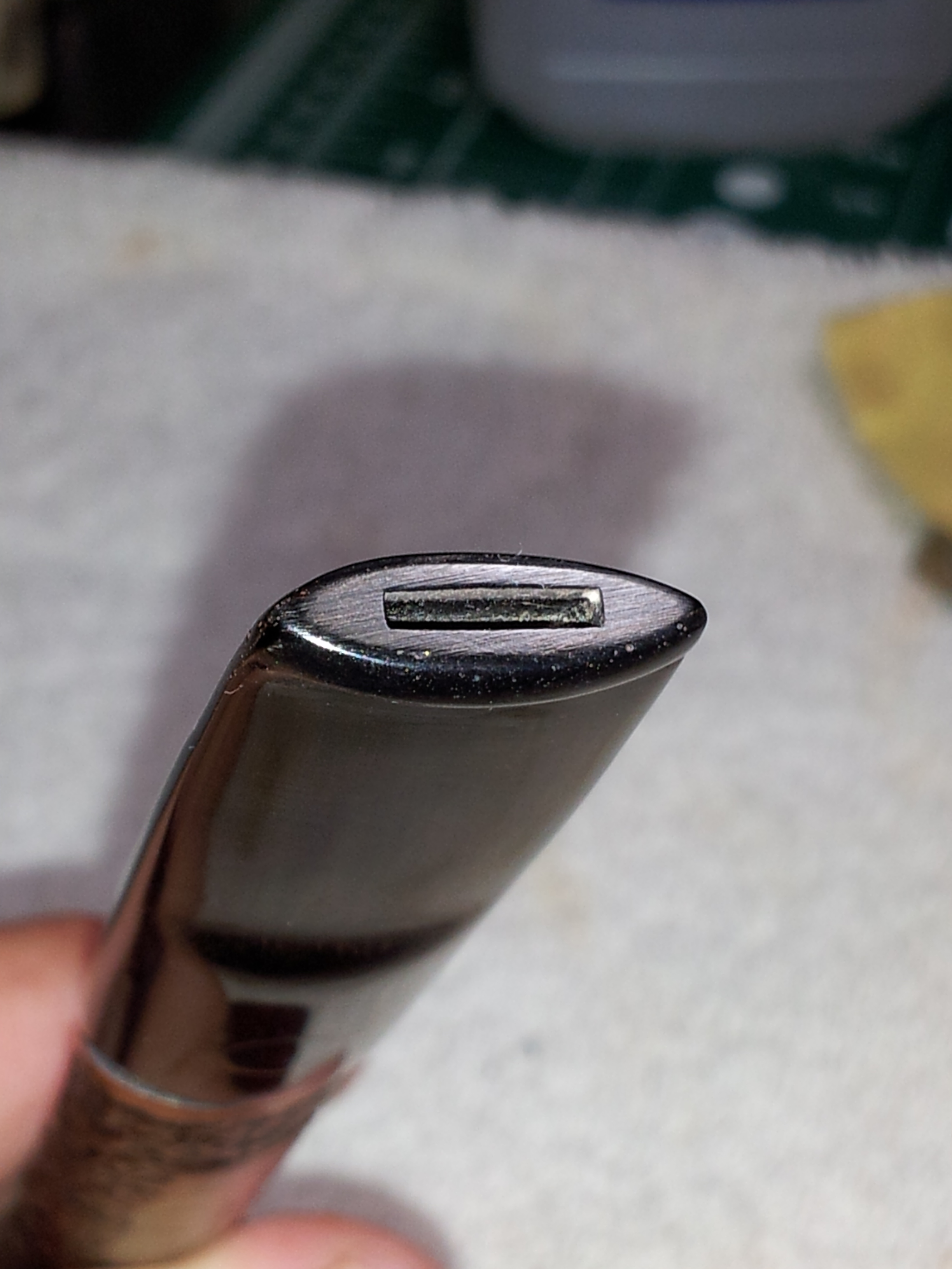 The flattened button and the poor condition of the shank stampings are, I believe, indications of over-buffing. The upper shank is stamped “Butz-Choquin” in script, over “Supermate”. The word “Major” is stamped at an angle below and to the right of the main stampings. On the underside of the shank, legible more by feel than by eye, are the remains of “France” over “1656”. There may have been a “St-Claude” over “France” at one point, but there’s nothing left to let me say for sure.
