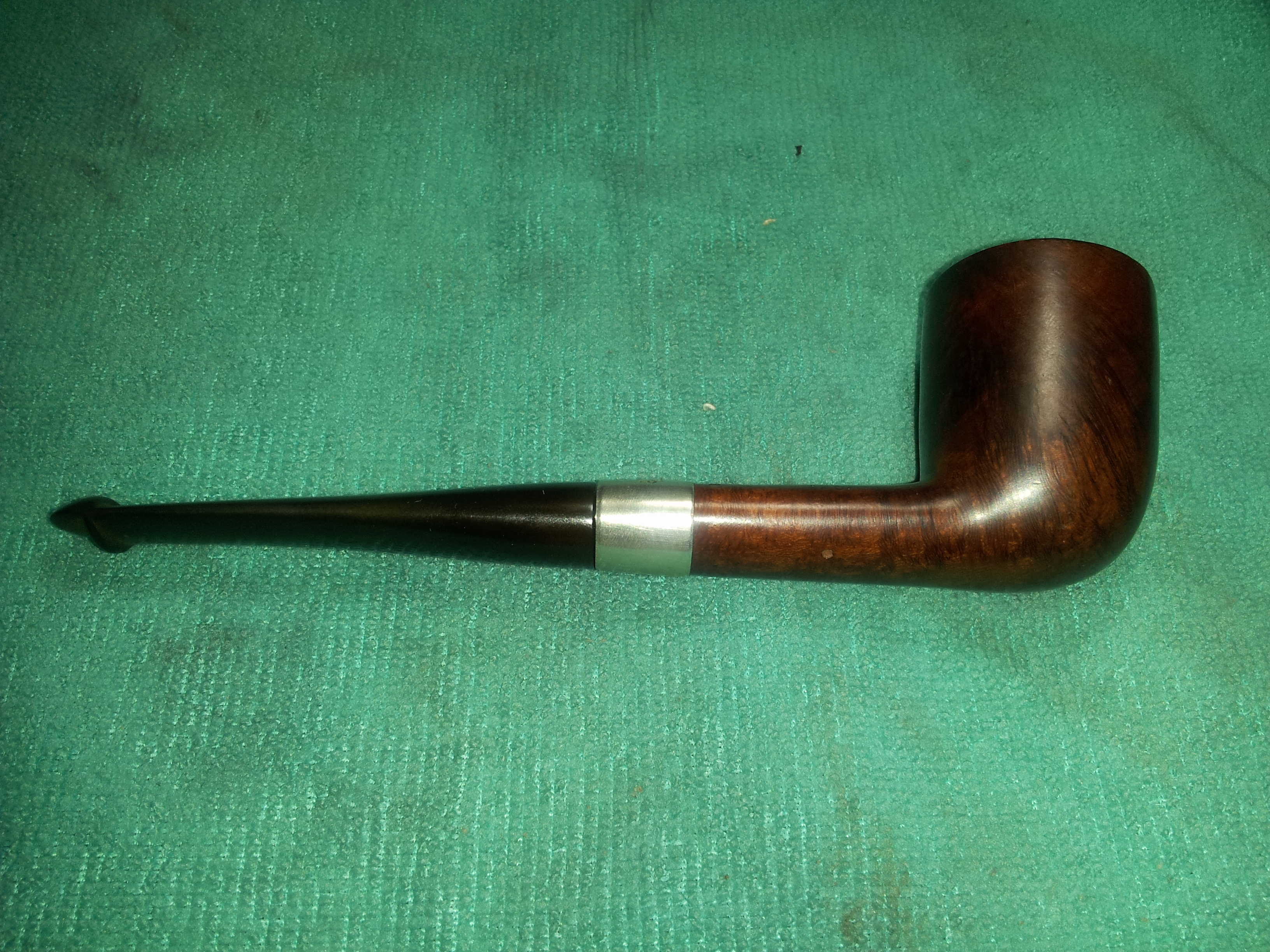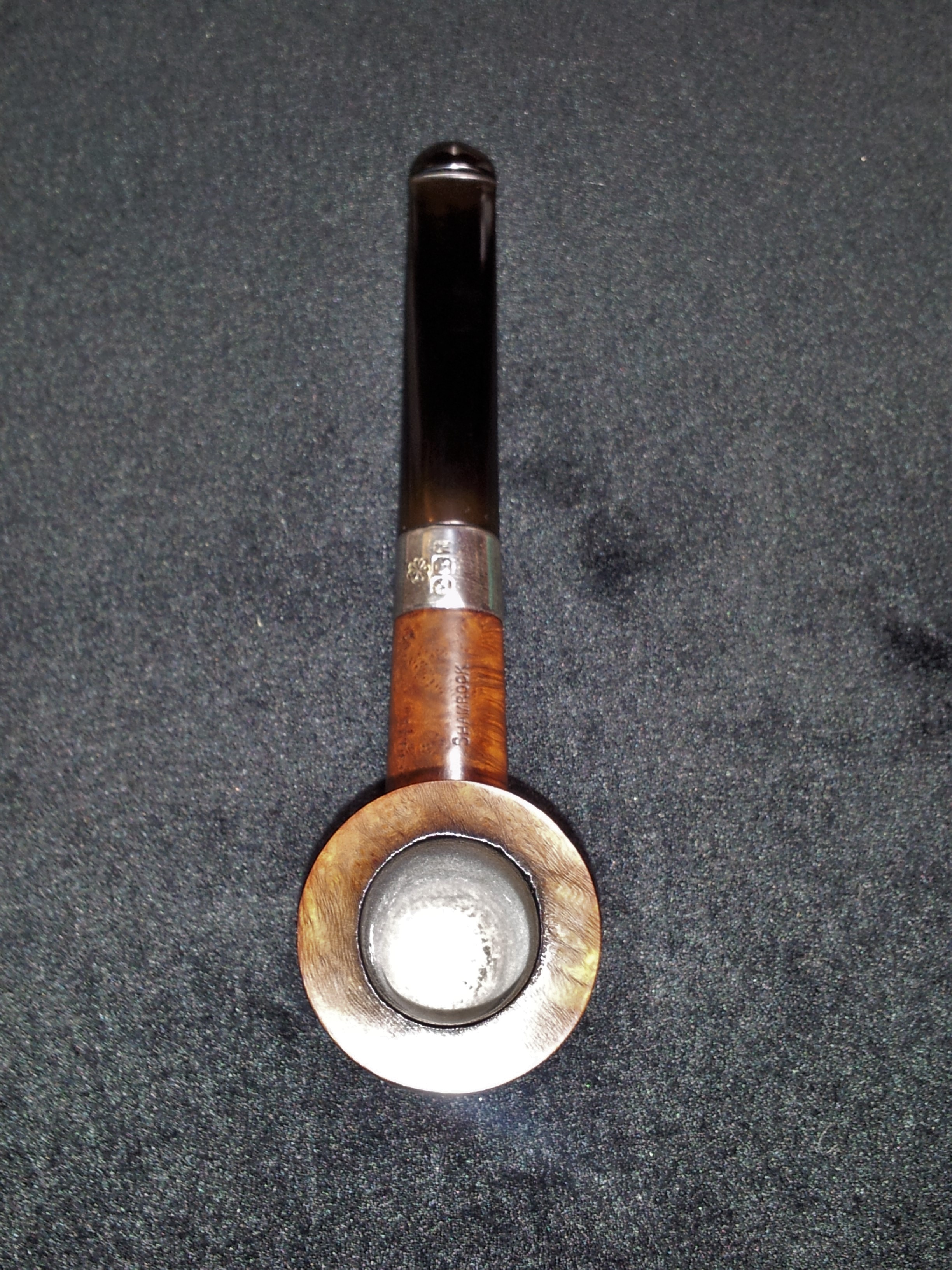 The pipe is a Shamrock 120F. The pinched-oval shank is stamped “Shamrock” in block letters on the top, “120F” on the right side, and “Made in Ireland” in a circle on the bottom. According to Pipephil.eu, this Country of Manufacture (COM) stamp was only used for a few years immediately following World War II (1945 through 1947), when it was replaced with a “Made in Ireland” block letter stamp. I believe that most Shamrock pipes are also stamped “A Peterson’s Product”, but there was no indication that this pipe had ever carried such a marking. The pipe is banded with a (probably) nickel band stamped with a shamrock over Peterson’s faux hallmarks of shamrock, wolfhound and tower.