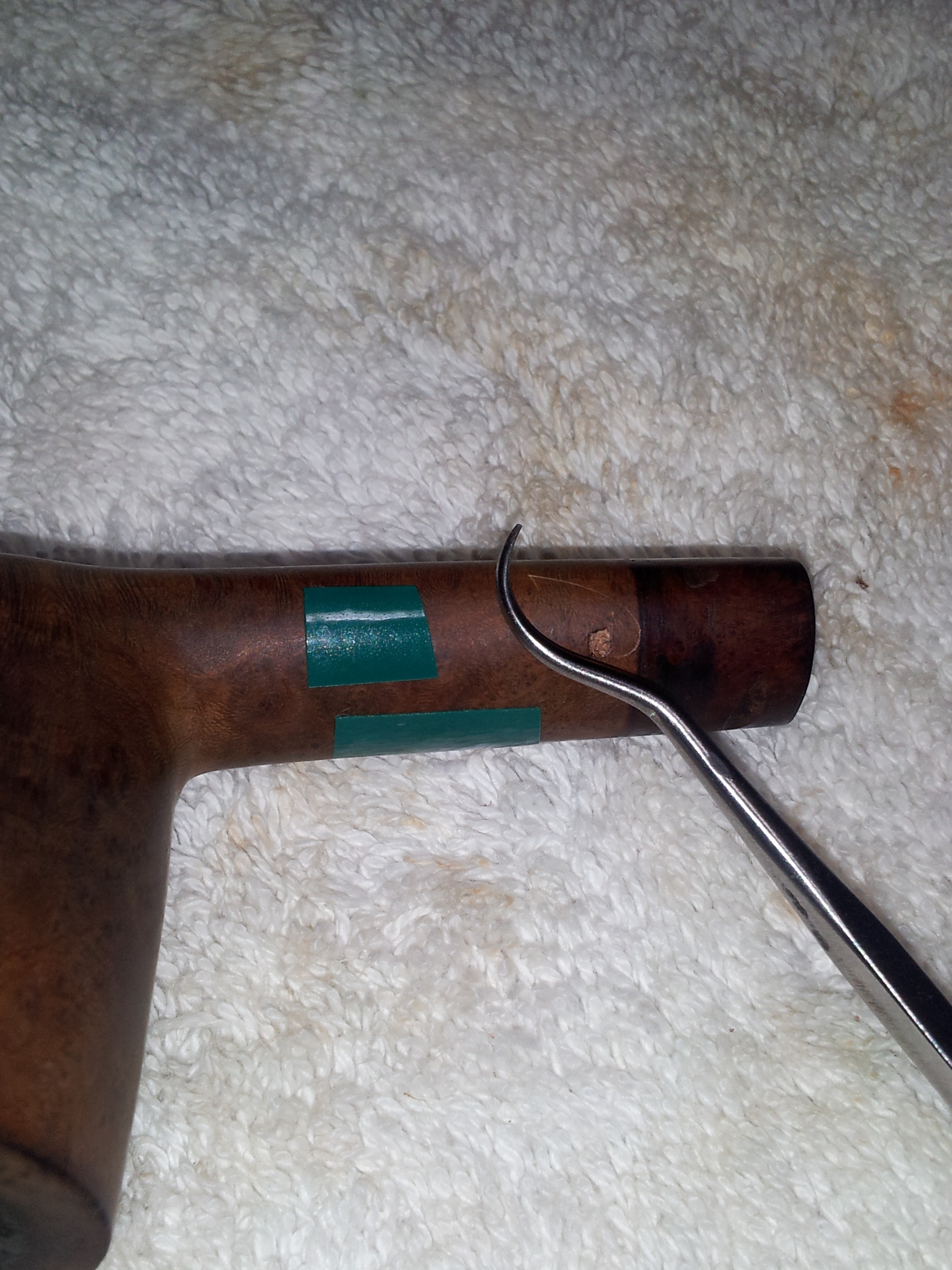 I wiped the stummel down with isopropyl alcohol and cotton pads to remove the surface dirt and any remaining wax. I followed this up with a scrub of Murphy’s Oil Soap to lift any remaining grime from the pores of the wood. I’m glad I did, as the nickel band popped off the end of the shank as I was drying the pipe with an old terry towel. This series of pics shows the results of each stage in this cleaning process. The missing fills really show up on the clean stummel. Hiding under band were two parallel slots, cut into the top and bottom of the shank over the mortise. I assume these were made at the factory to provide a means of gripping stummel securely, probably during staining and finishing. If anyone can enlighten me about these slots, I’d love to hear the story!
