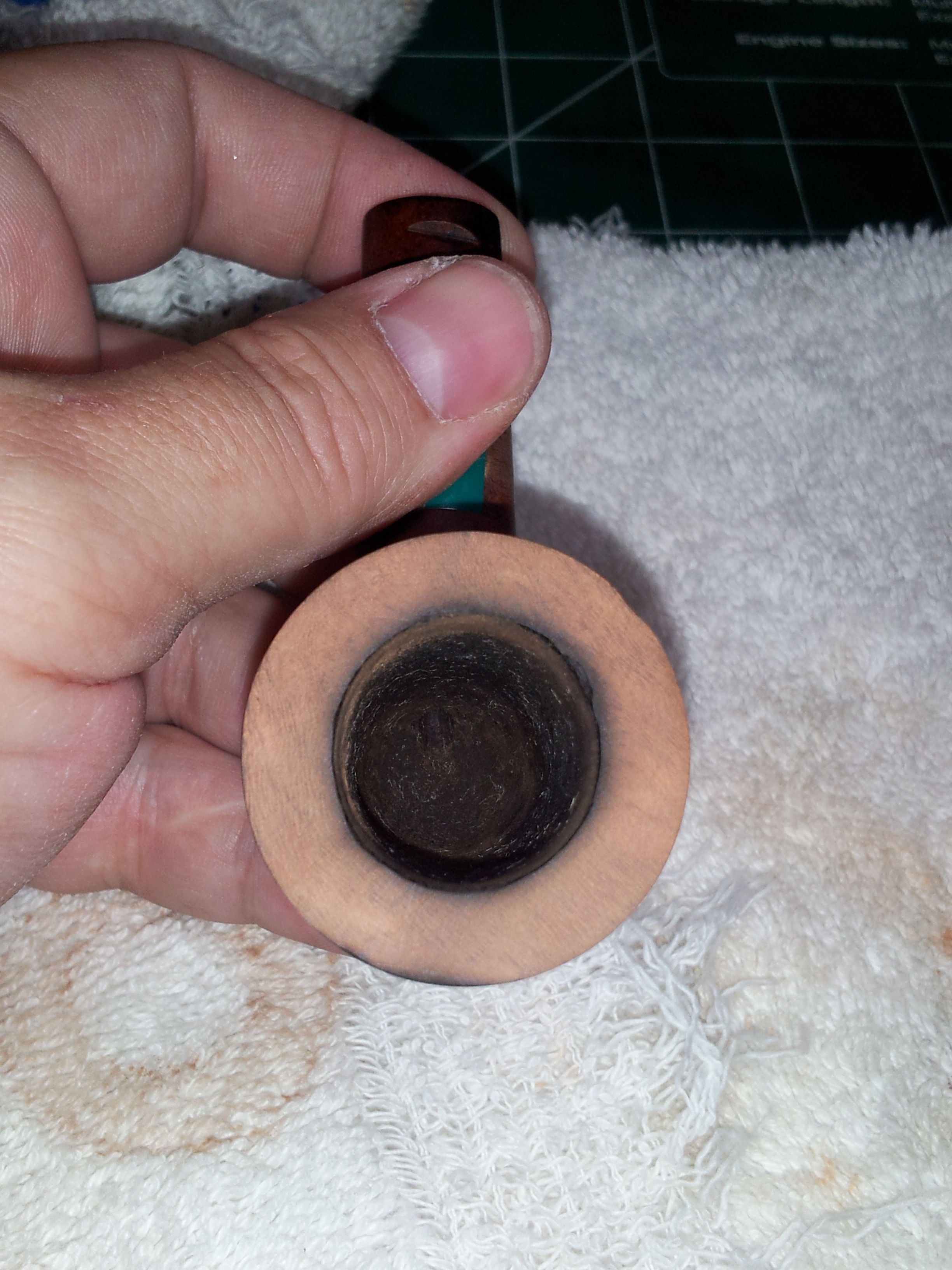 Like almost all of my pipe refurbs, I started this one by reaming the old cake from the bowl using 80-grit sandpaper wrapped around a dowel, or in this case, a Sharpie. You can see in the pics below how much the reaming helped to restore the round appearance of the bowl’s inner rim, though more work would need to be done.