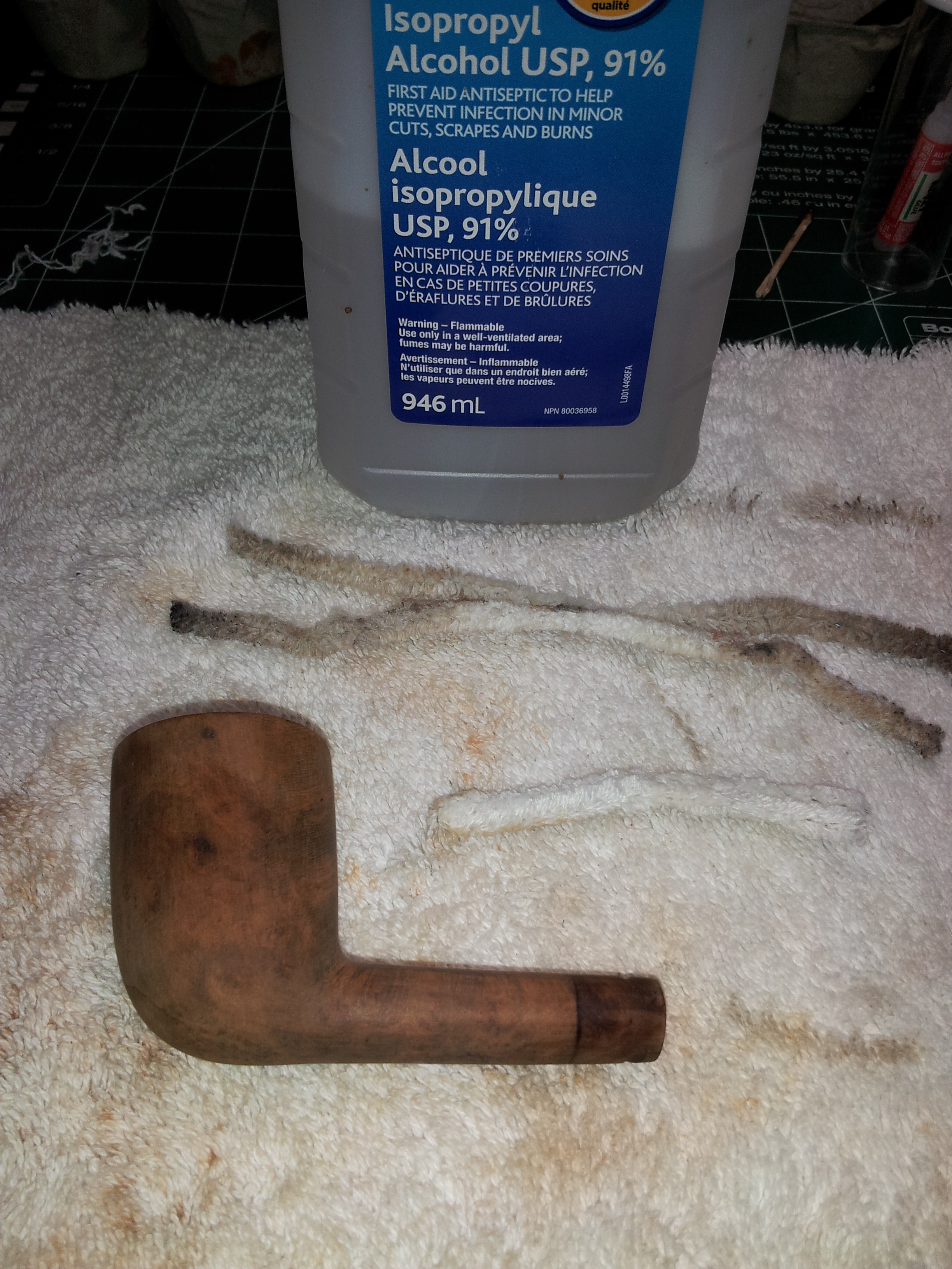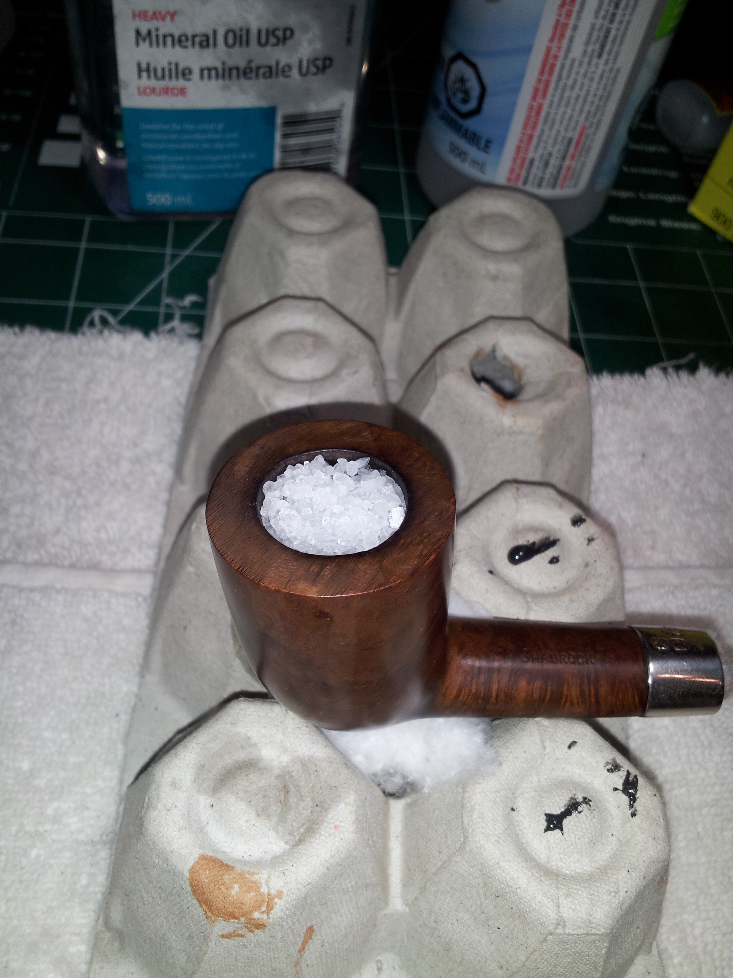Before buffing and waxing, I de-ghosted the pipe using kosher salt and isopropyl alcohol. After removing the stem, I plugged the shank with a bit of cotton ball and then filled the bowl with kosher salt. Then I carefully added alcohol to the bowl just until it was barely visible around the top of the salt. The stummel is left to sit for 24 hours, during which the tars, gunk and associated odours are pulled from the briar into the salt. I forgot to take a picture of the dirty salt, but the colour was not unlike that of rotten teeth – yum!