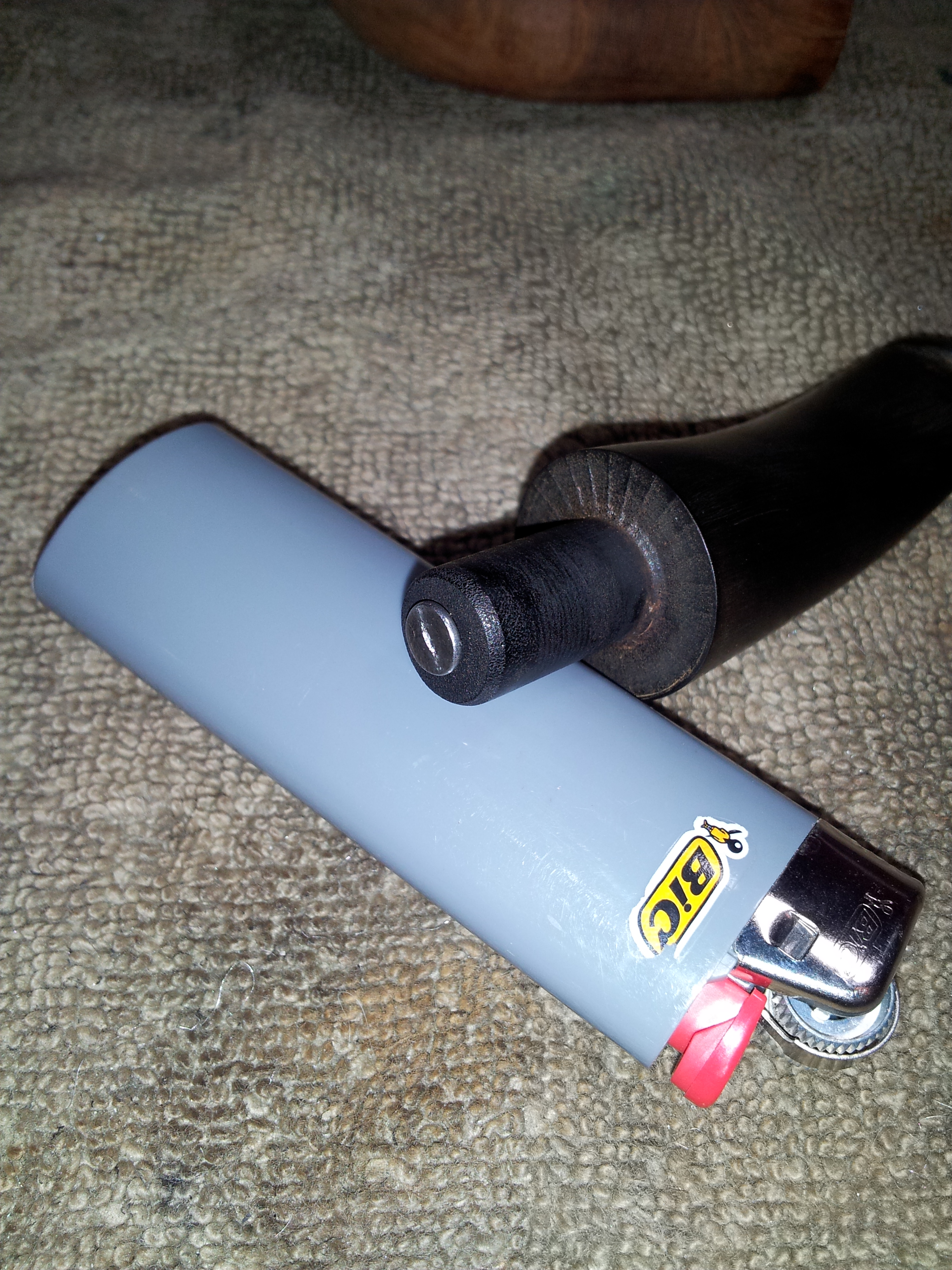 Meanwhile, I soaked the stem in Oxyclean and warm water to lift the oxidation, which was scrubbed off using Magic Eraser and then 600 – 2000 grit wet sandpapers. I cleaned the stem’s internals with pipe cleaners and alcohol before adjusting the fit of the tenon in the mortise. This was accomplished by heating the rather fat tenon over a lighter until maleable and then pushing it against a flat surface. I slid a suitably sized nail into the tenon’s airway before doing this to help keep the tenon straight and the airway open. It didn’t take much effort to expand the tenon sufficiently to give a comfortably snug fit.