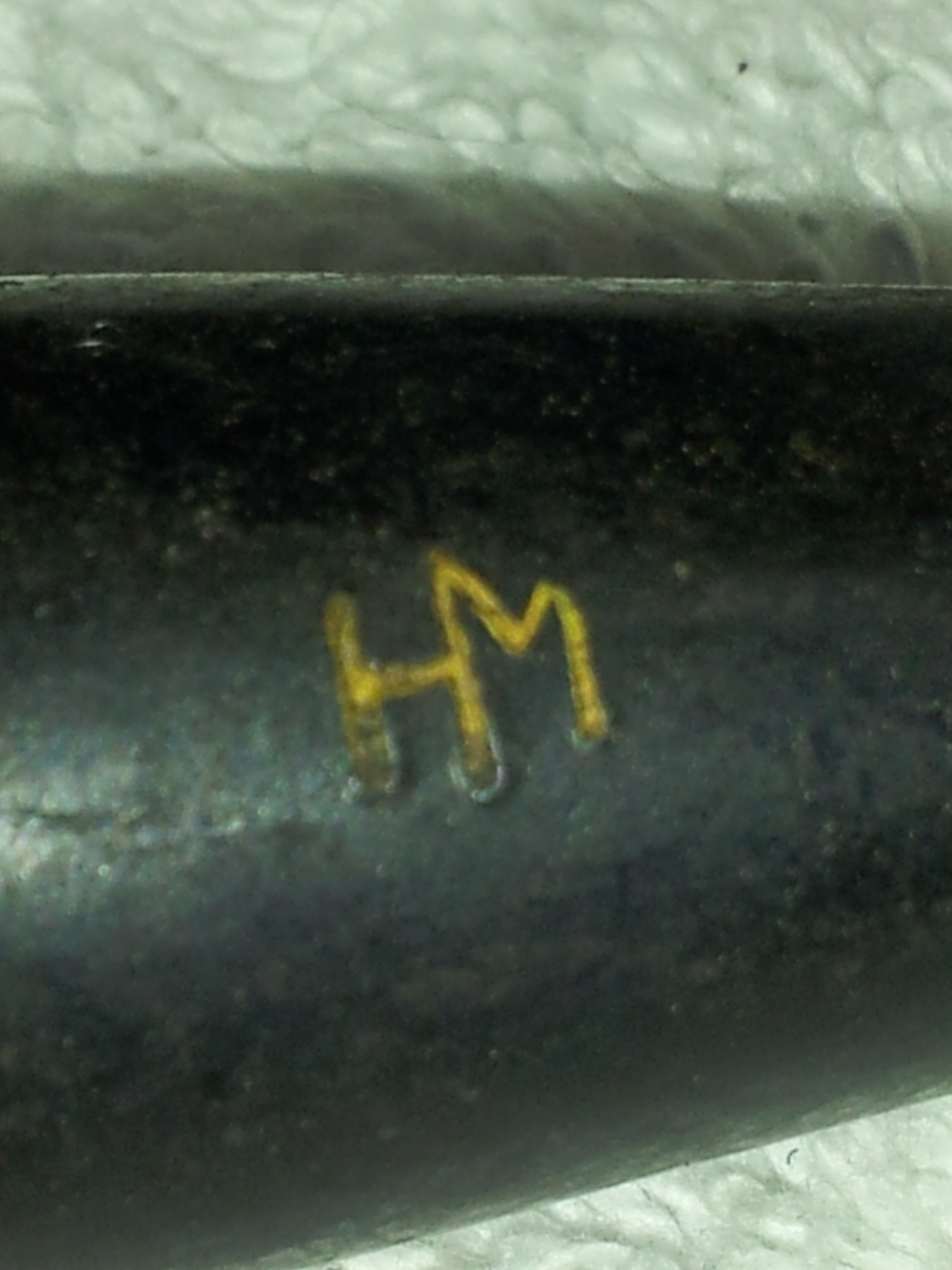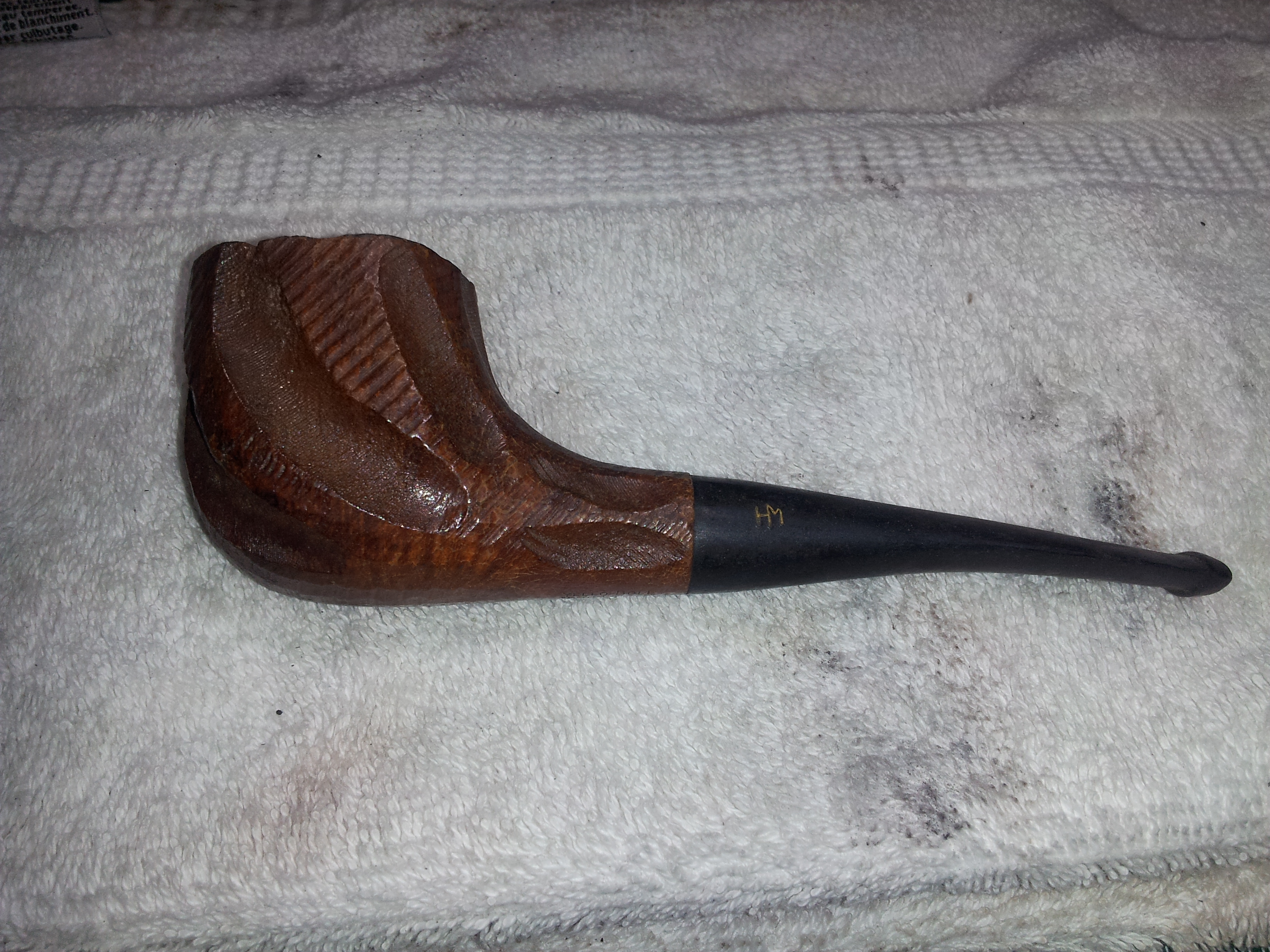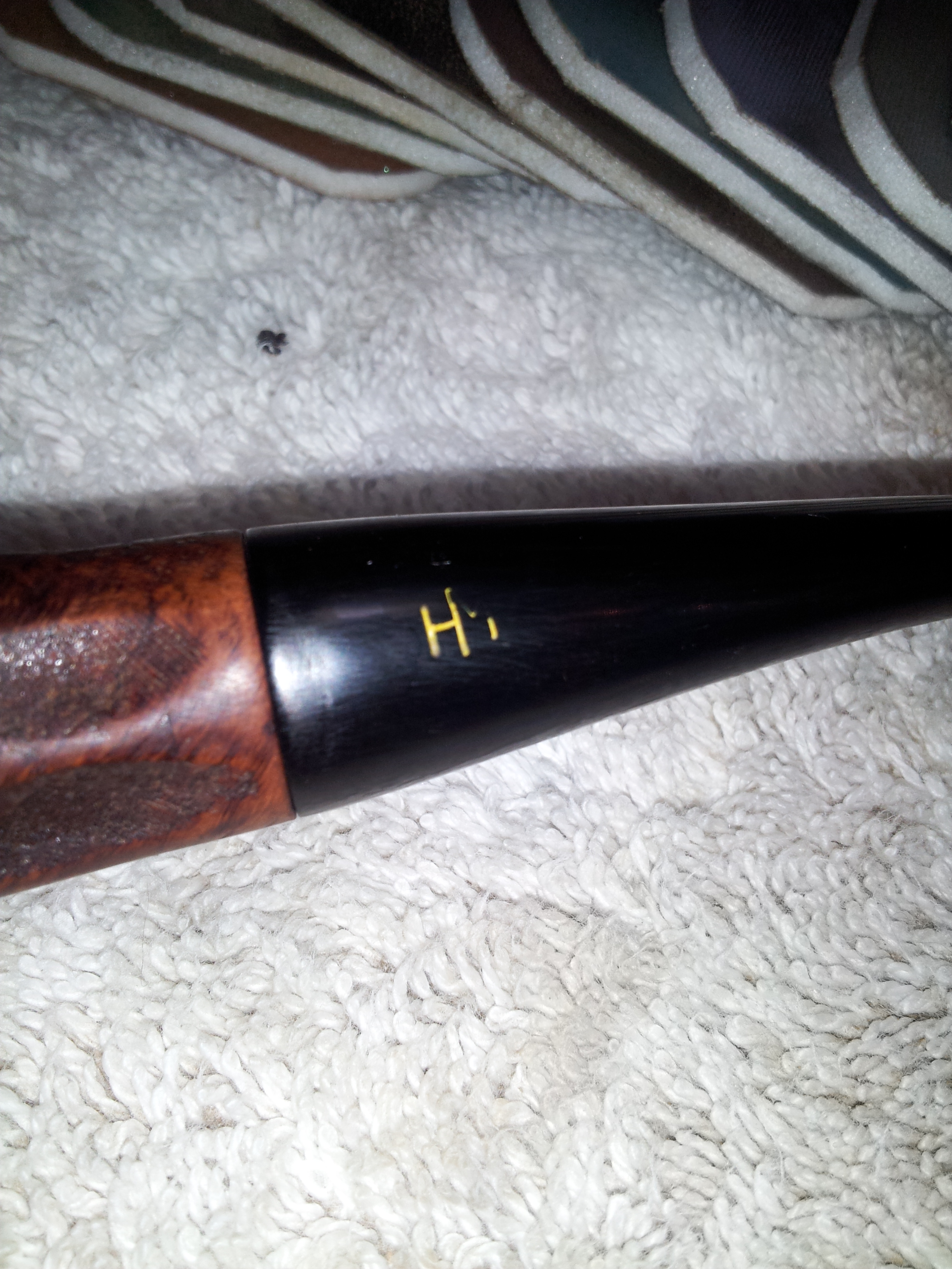 The other gaff I made with this stem concerns the logo. As the original pictures show, the “HM” logo was pretty much intact at the beginning of this job. Through inattention and/or overzealous sanding, I managed to remove the top right corner of the M. In a rush of impatience to get the pipe finished, I ignored my better judgement (which was to paint in the damaged parts using a fine artist’s brush) and attempted to re-cut the lines of the M so I could fill the logo in with wax filler stick. I can hear you all wincing from here – yep, I pooched it, making the damage worse instead of better. I tidied it up as best I could without completely obliterating the logo, but the damage is done, and I’ll have to live with it. I know only a collector or fellow piper will ever notice, but the damage I inflicted will loom large for me every time I look at this pipe.