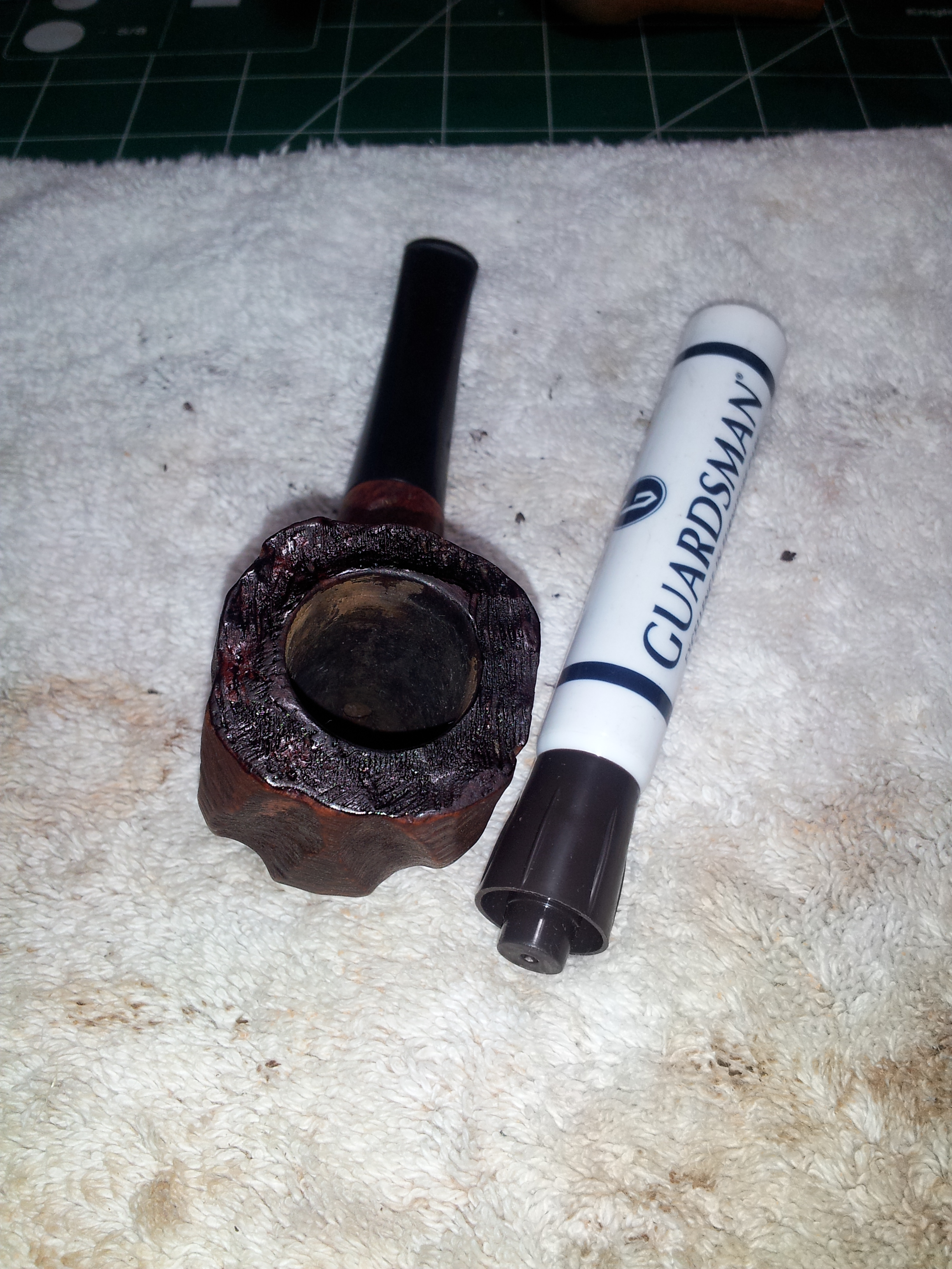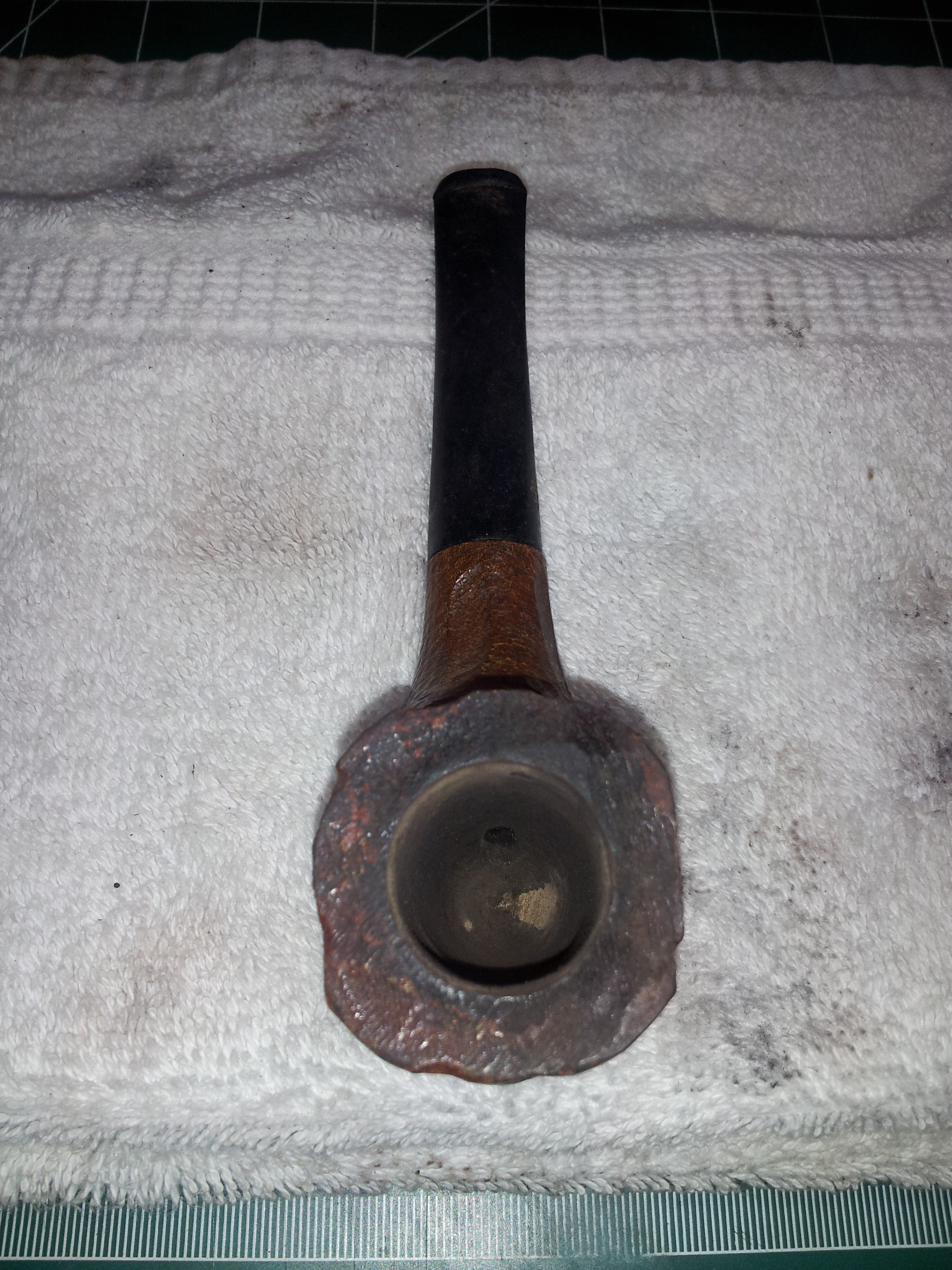 The internals of both stummel and stem cleaned up easily with pipe cleaners dipped in alcohol or white vinegar, respectively. This wasn’t surprising, given the amount of yellow bowl coating remaining in the tobacco chamber. This pipe didn’t see a great deal of use by its original owner.
