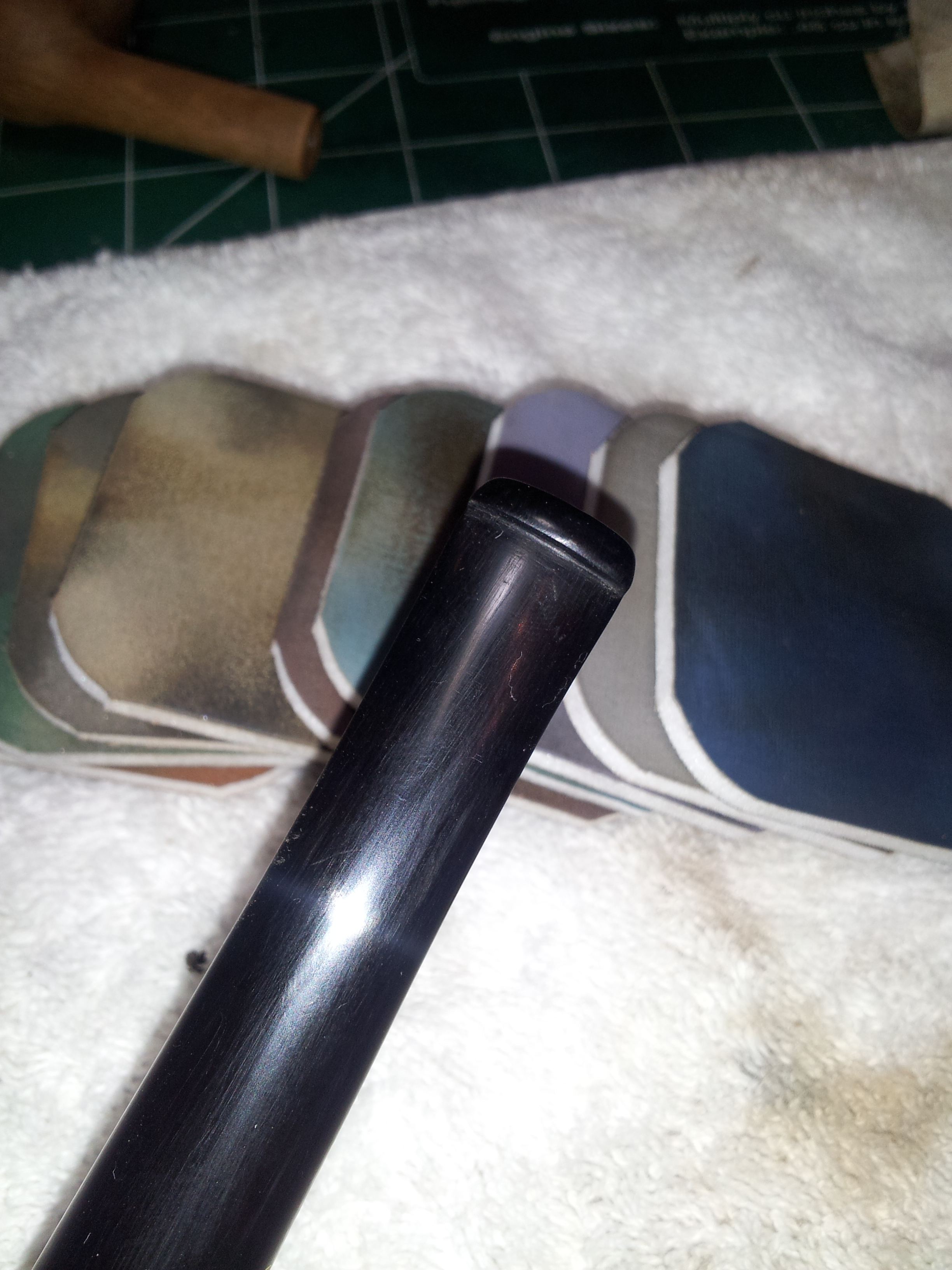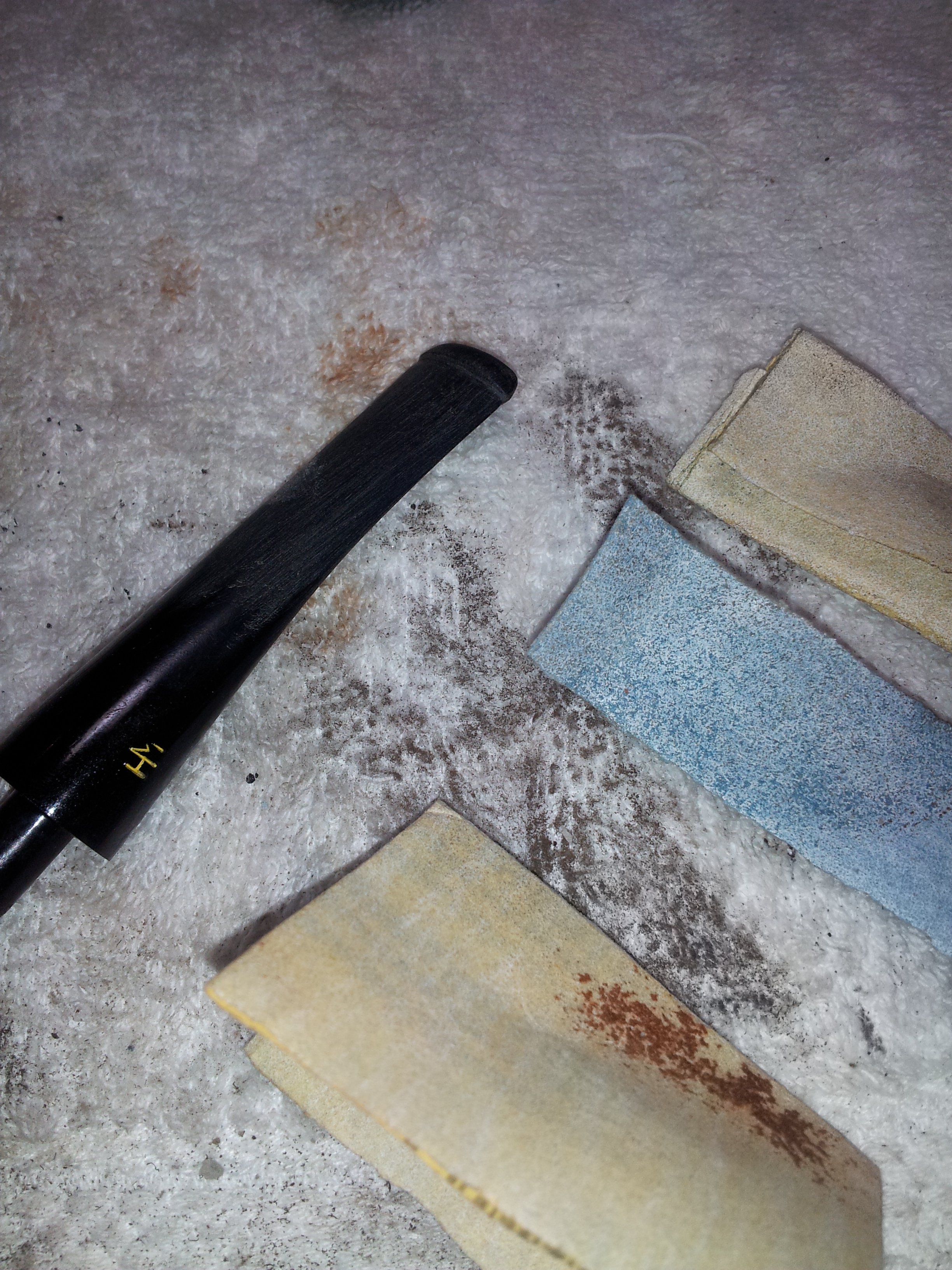 I sanded the stem with 220 and 320 grit sandpaper to remove the tooth chatter, and then used medium and fine sanding sponges to remove the sanding scratches. This stem proved quite easy to work with, unlike some other nylon stems I’ve seen that never really took to polishing. I finished up the stem work with MicroMesh pads in 1500 – 6000 grits. Usually I’d use the full range (up to 12000 grit) of pads, but the stem really didn’t need them this time.