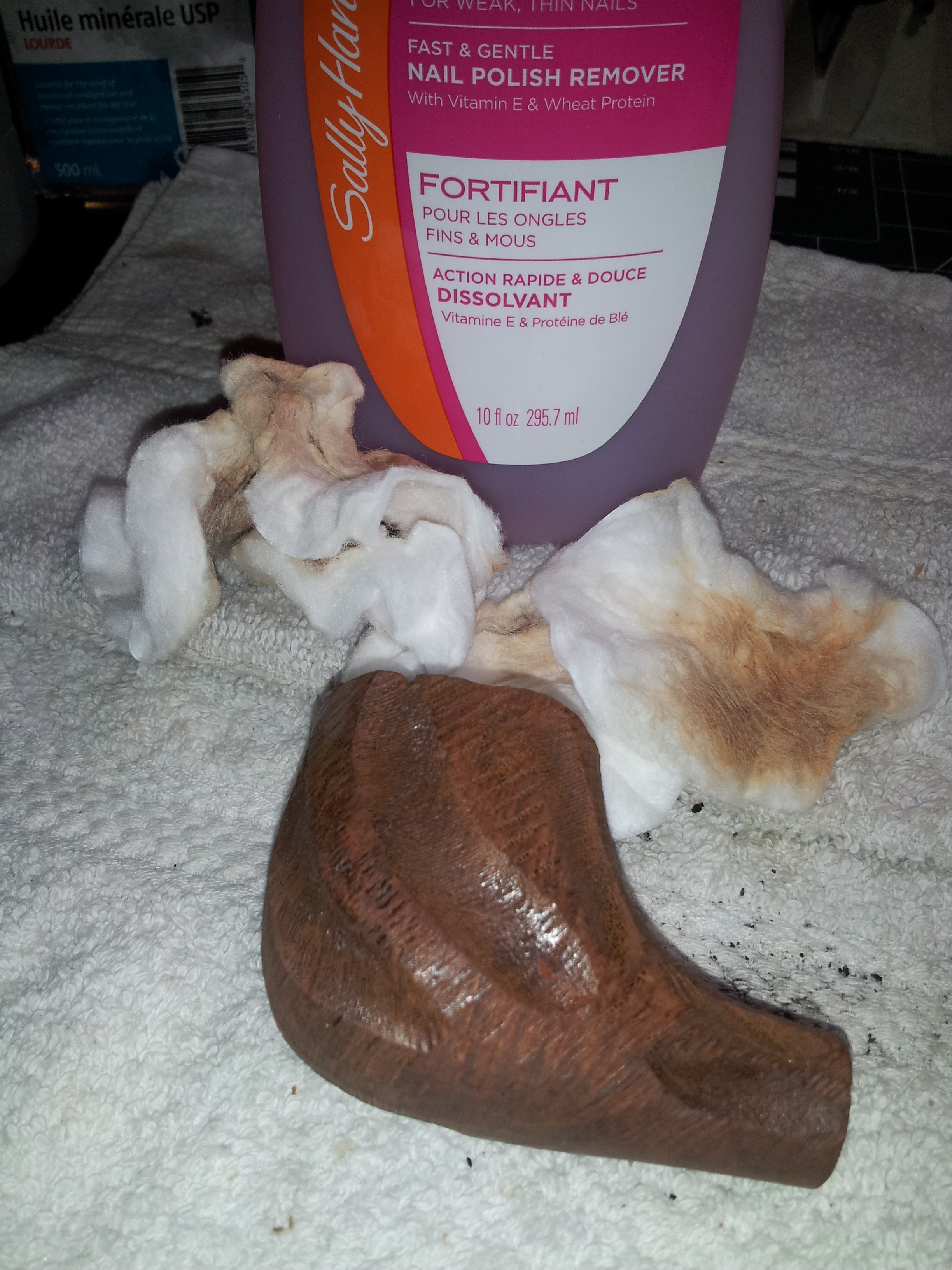 As you can see in the second to last pic above, the factory lacquer on the bowl was crackled and missing in spots, so I dropped the bowl into an alcohol bath to try to dissolve the old finish. The lacquer on this pipe proved particularly tenacious, and I wound up both wiping the bowl with acetone and sanding the thicker spots before I had clean briar everywhere. The cleaning also highlighted what I think are putty fills on the rather wide rim of the pipe. A wide patch on the right-hand side of the rim showed up pinkish after cleaning, while the rest of the rim was brown/black.