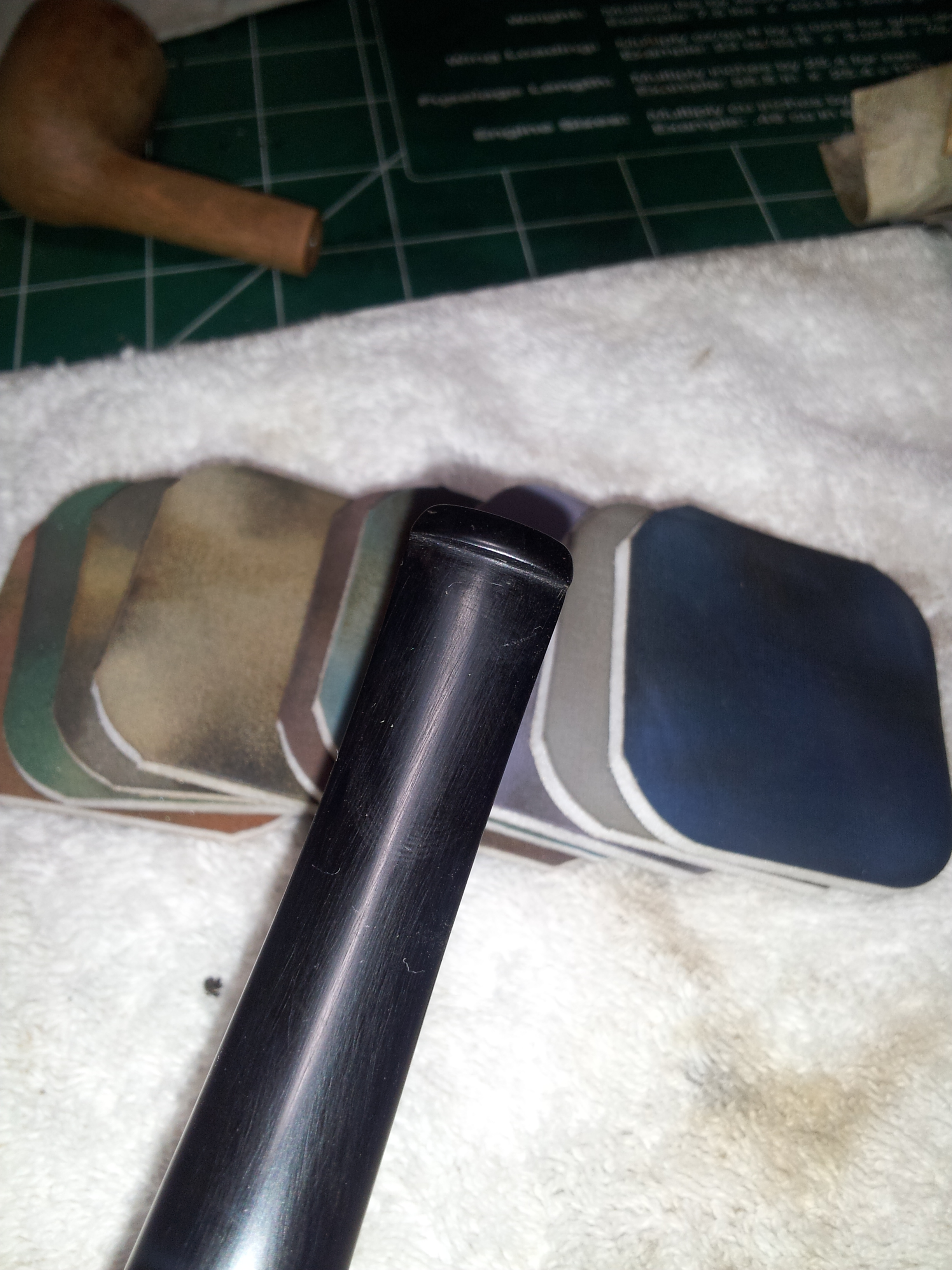I actually spent more time correcting the stem fit than I did sorting out the tooth chatter. The stem originally fit very loosely in the mortise, loose enough in fact for the bowl to rotate towards the floor when the pipe was held by the stem. I goofed on my initial attempt to enlarge the stem with heat – a procedure that works well on vulcanite stems, but not, as it turns out, on nylon tenons. I applied heat to the tenon using a Bic lighter, and then pressed the end of the tenon against the flat surface of my work table. A vulcanite tenon will compress slightly, making the sides of the tenon bulge outwards. The nylon tenon simply mashed flat at the end, resulting in an odd T-shape. Not good. I had to go back and sand the tenon round again, but now slightly shorter than it had been, and re-align the airway using a small round needle file, as the mashing of the tenon end had bent the airway off-centre. Ugh.