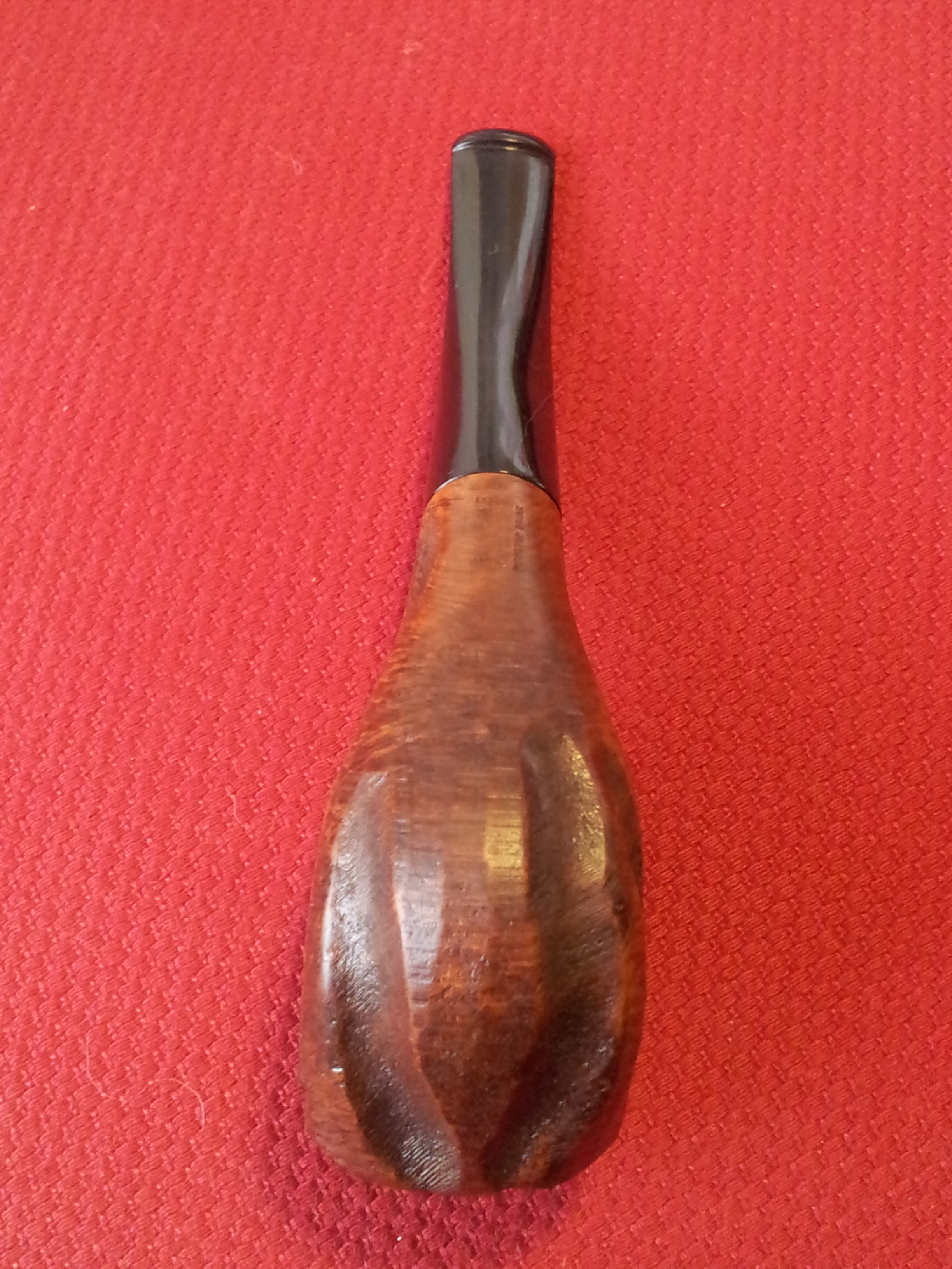 Moving on as best I could after the logo debacle, I debated stain options for the stummel. In order to get a good look at the natural colour and grain of the briar, I wiped the stummel with mineral oil. Immediately the wood changed from a mousey light brown to a deep red with darker grain running throughout. I liked it so much that I decided to leave it that way. The only stain I applied was to the rim, which I coloured in with my darkest stain pen. This both hides the pink fills and gives a nice contrast to the red of the bowl. The colours toned down a fair bit after buffing and waxing, giving the briar a natural, slightly aged virgin finish. I think it suits.