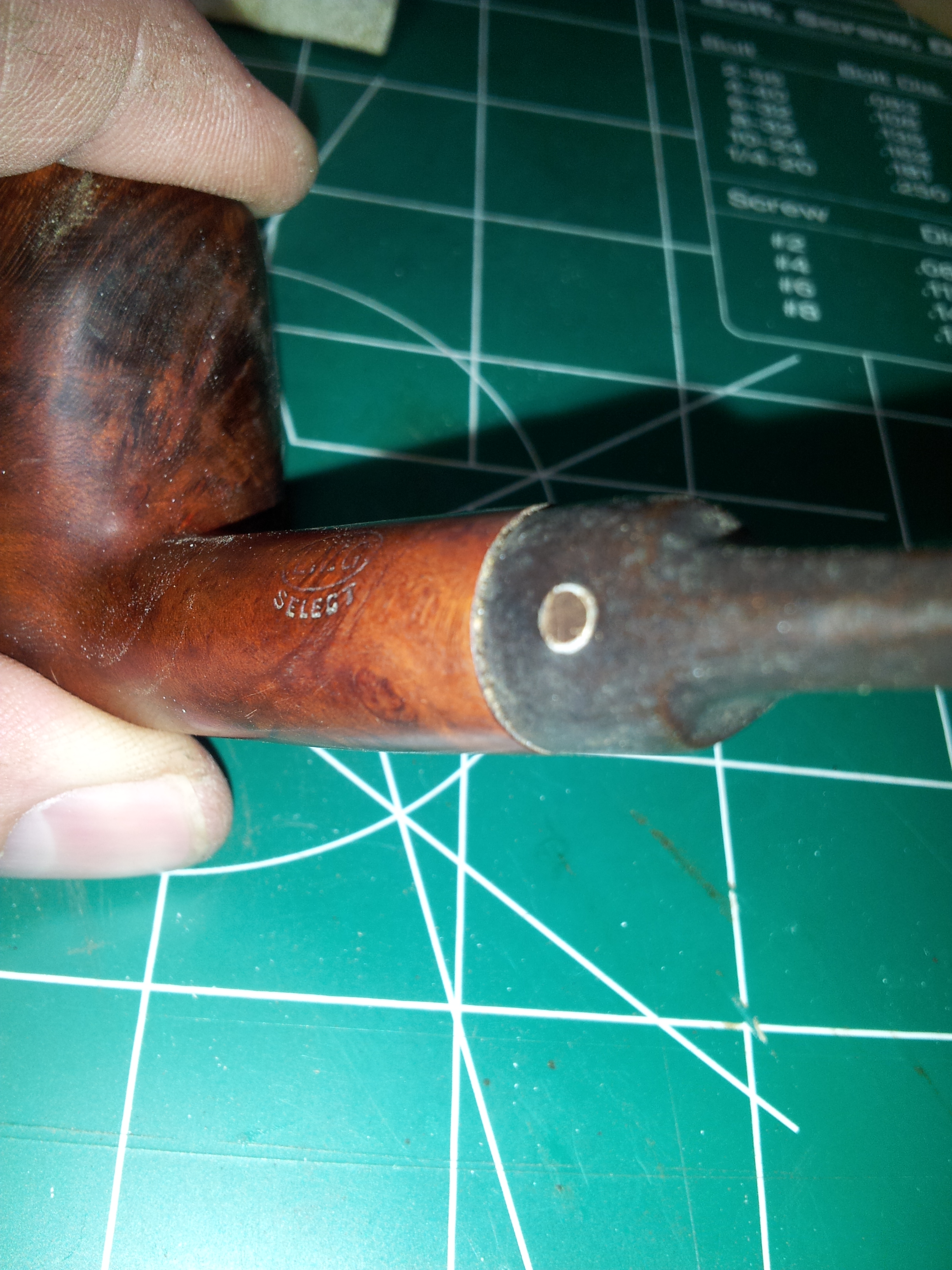 The bowl was in relatively good shape, but with some obvious fills that would need some work to disguise. It was stamped “LVG” over “Select” on the left shank, and, barely visible, a round “Made in England” stamp on the top right shank. The stem I chose to fit to the bowl came had a largish silver/steel dot on the left side, but otherwise bore no identifiable markings. I had no luck finding any information about these markings on either Pipedia or Pipephil. If anyone can shed some light on the origins of these parts, I’d be grateful. Here are the parts as found: