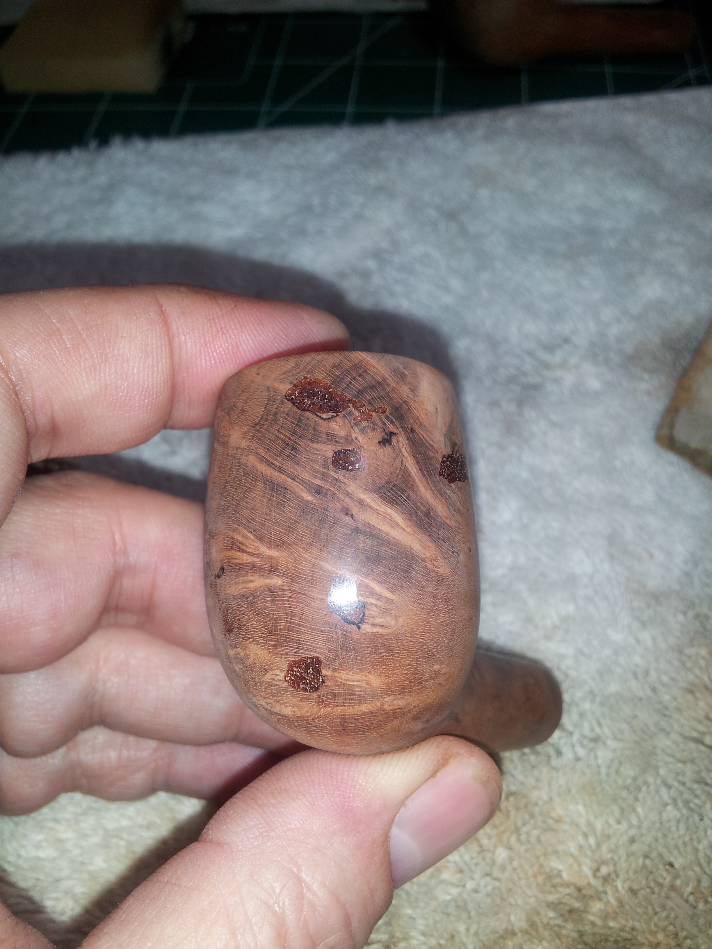 As epoxy won’t take stain, I fitted a small round carving burr to my rotary tool and ground out the epoxy fills. I then patched the pits with briar dust and CA glue, filing and sanding the new fills flush with the briar after the CA had cured. There were quite a few of them – 6 in total, mostly on the front face of the bowl.