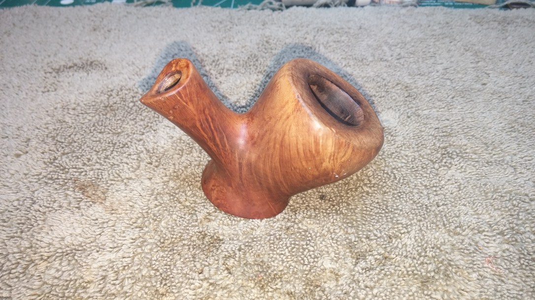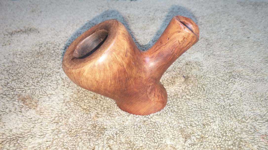The pipe in question came to me in a box of estate pipes sent for restoration. The pipe had clearly been re-stemmed at least once in its life already, but the stem currently fitted was very loose in the mortise and the owner and I agreed that it was severely lacking stylistically. The stem simply did not suit the pipe. Here is the stummel without the offending stem.