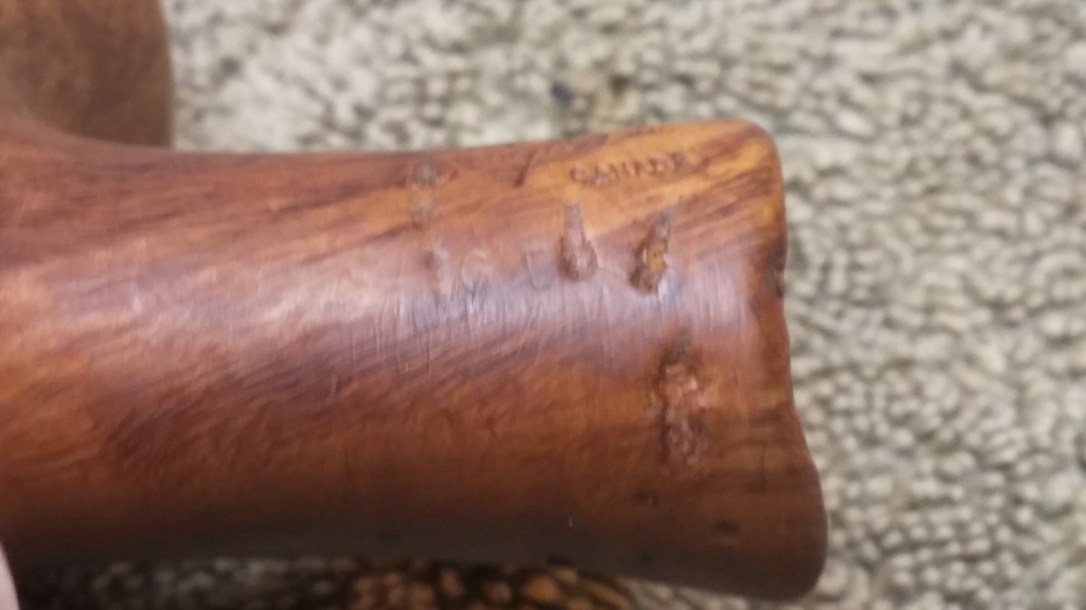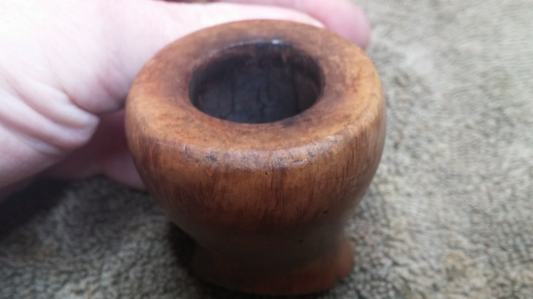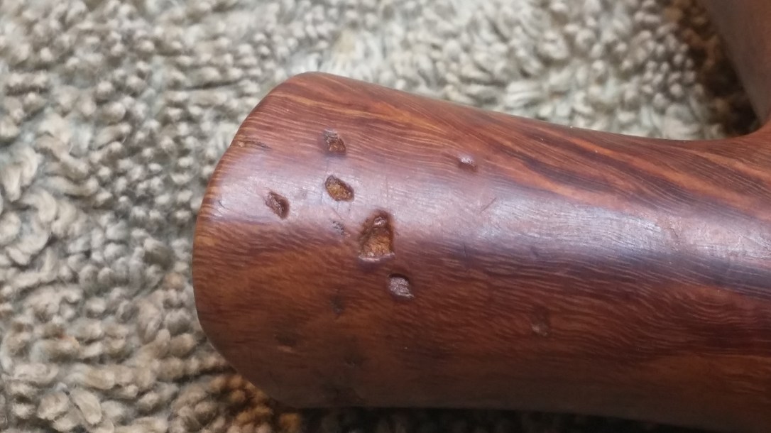 The stummel itself was in decent condition, without cracks or major structural issues. There was, however, a proliferation of evenly sized dents on the shank and rear of the bowl. The dents reminded me of the marks left by a fork in a potato prepped for baking. There was also a patch of road rash on the front rim of the bowl, and much of the rim was darkened from use.