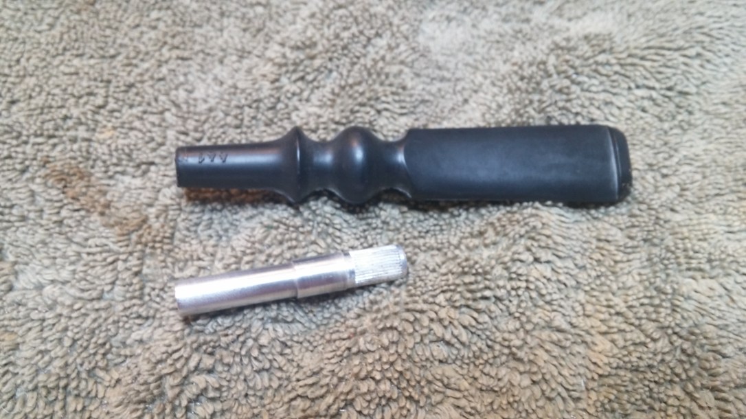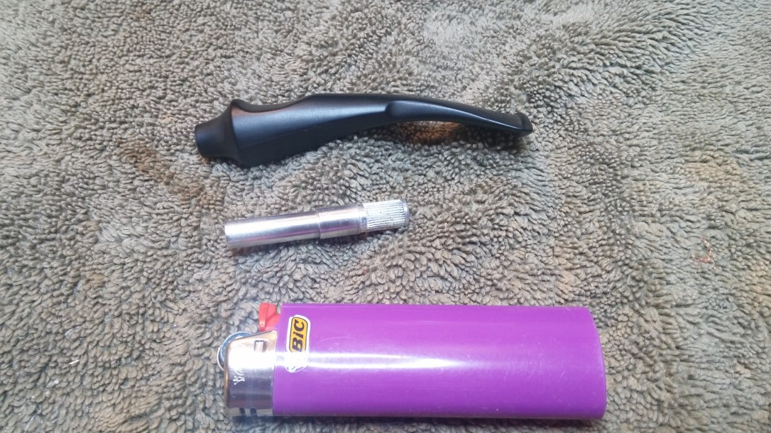 The stem that came with the pipe was basically a throw-away for this job, but it did have one valuable part – the original aluminum tenon. Before I tossed the stem into my spare parts bin, I salvaged the tenon by heating the metal over a lighter flame until it came loose from the vulcanite stem. This shot shows the removed tenon and the clunky-looking stem the pipe came with.