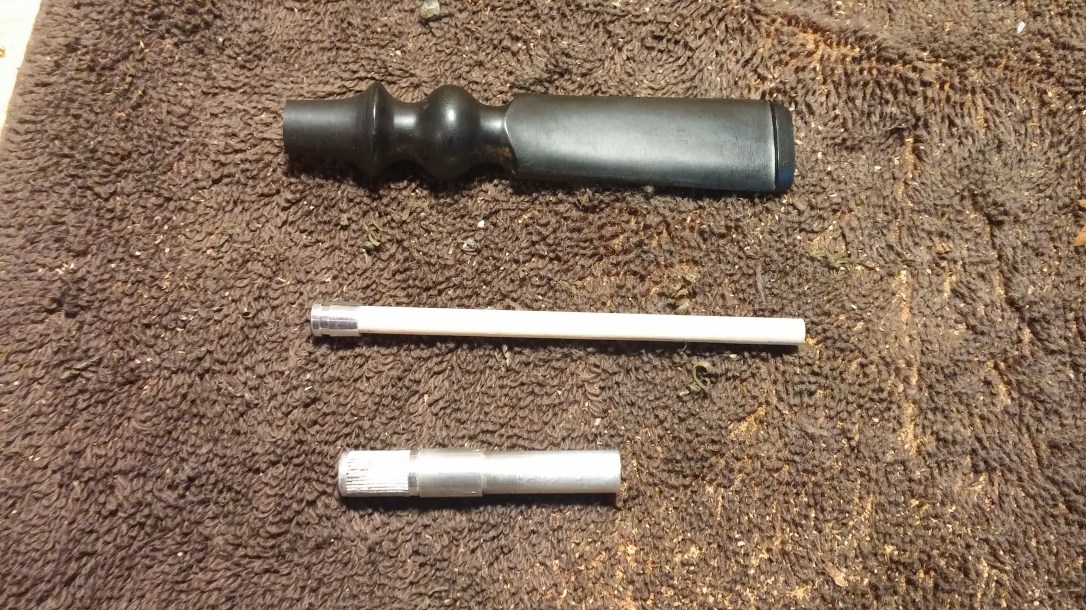 The second step was to drill out a 1/4″ mortise in the end of the stem to accept the aluminum tenon. On a taper or saddle style bit, this operation is straightforward. On a freehand bit it’s a more delicate operation due to the small stem diameter at the tenon end. I worked slowly, drilling the stem in several short runs. I hoped to avoid damaging the stem, but part way through the process I heard the telltale snap of cracking vulcanite. Ouch! Thankfully the crack was short, allowing me to cut off the damaged tip and reface the end before re-drilling both the mortise and the filter shaft to make up for the lost stem length. Here is the stem, tenon and filter after drilling.