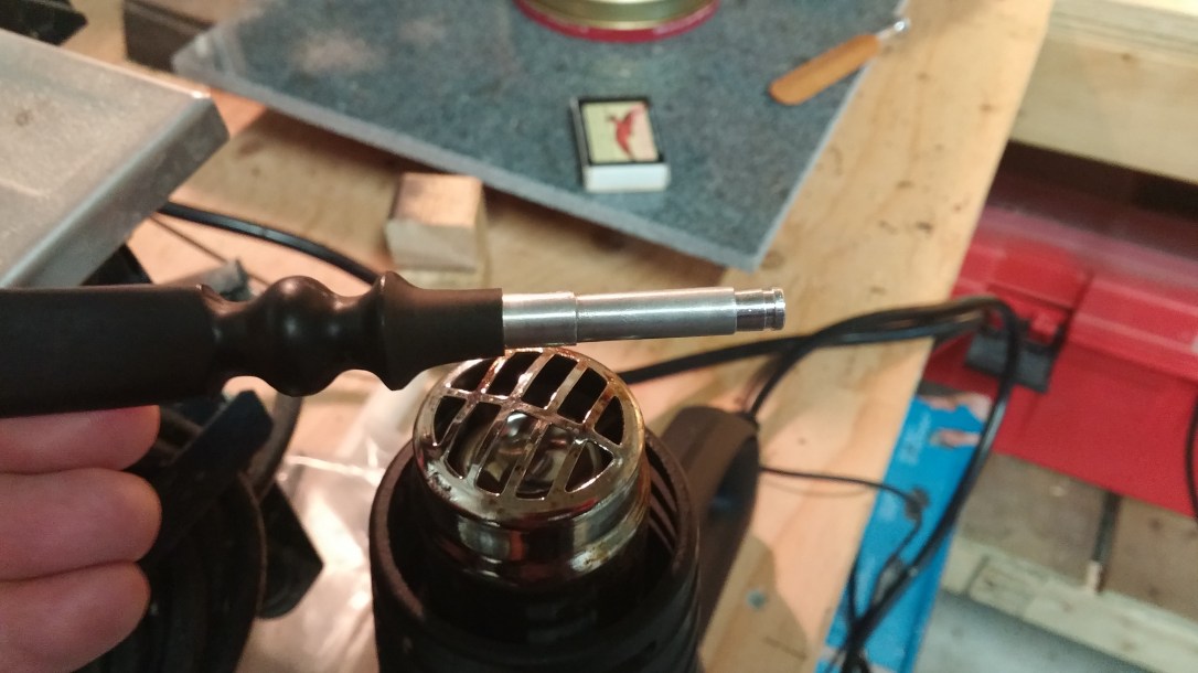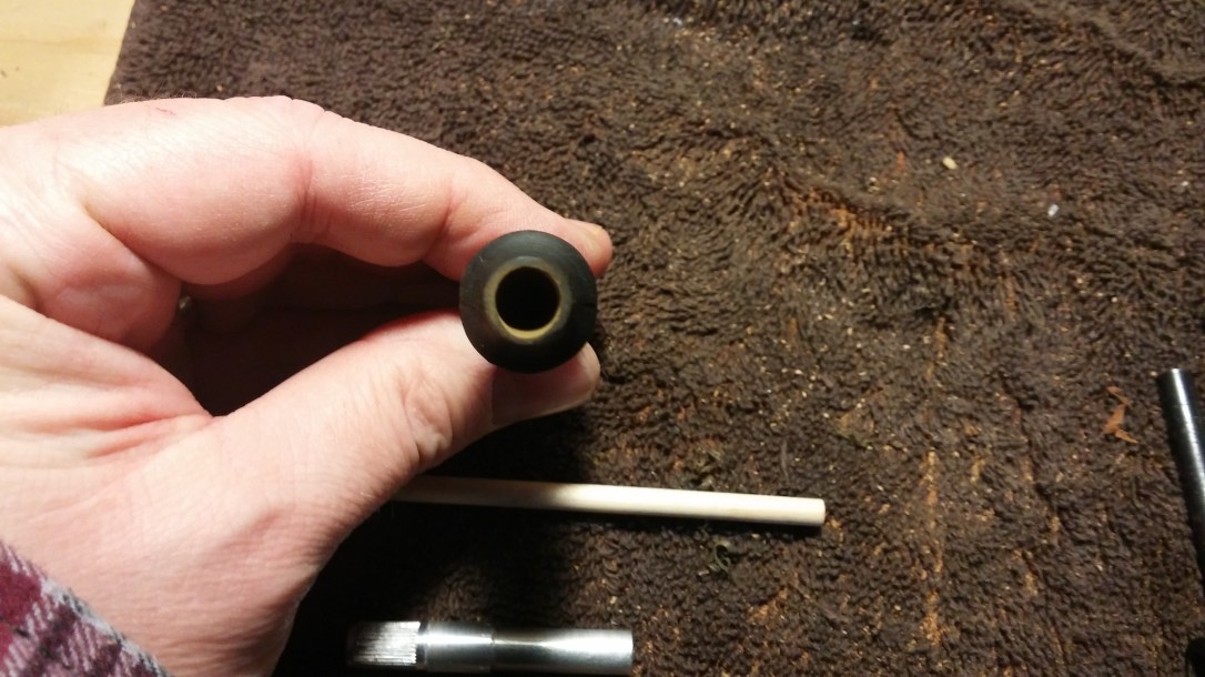 The 1/4″ mortise I drilled was slightly smaller than the knurled end of the aluminum tenon. I did this on purpose to achieve a tight, lasting fit when I heat-set the tenon. To do this, I warmed the business end of the vulcanite stem over the heat gun until it was soft enough for me to push the tenon into place. When the stem cooled, it shrunk back to size, gripping the tenon tightly as it did.