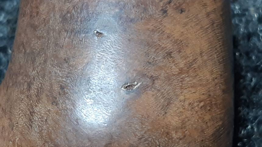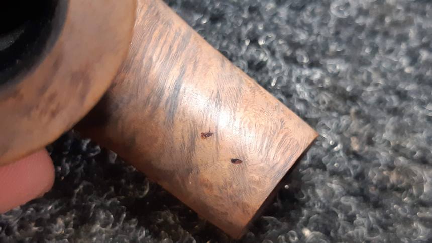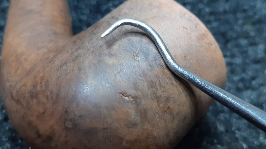 From the rim I moved on to addressing a few fills that had shrunk and needed replacing. I picked out the old putty with a dental pick, then drop-filled the cavities with CA glue mixed with briar dust. When the glue had fully cured, I used needle files and sandpaper to level the patches and smooth out the finish.