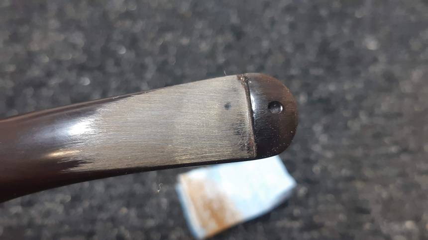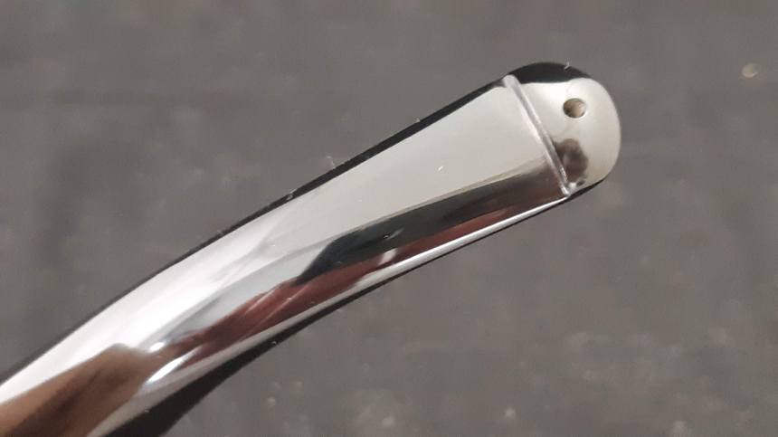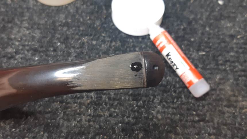 I drop-filled the dents on both sides of the bit with clear CA glue and sanded things flat after the glue had cured. I also used a needle file to sharpen the rear edge of the button. When I was happy with the state of things, I sanded and polished the repair to 2000-grit.