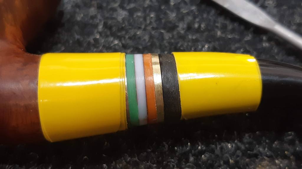 The owner of this lovely older Pete sent me a few pics and asked if I could help repair a missing shank detail. As you can see in these pics, the pipe had originally been fitted with a stacked shank extension in a Brass-Green-White-Red-Brass configuration. Sadly the outside brass layer had detached and been lost somewhere along the way.