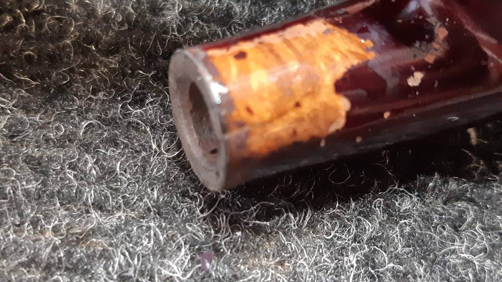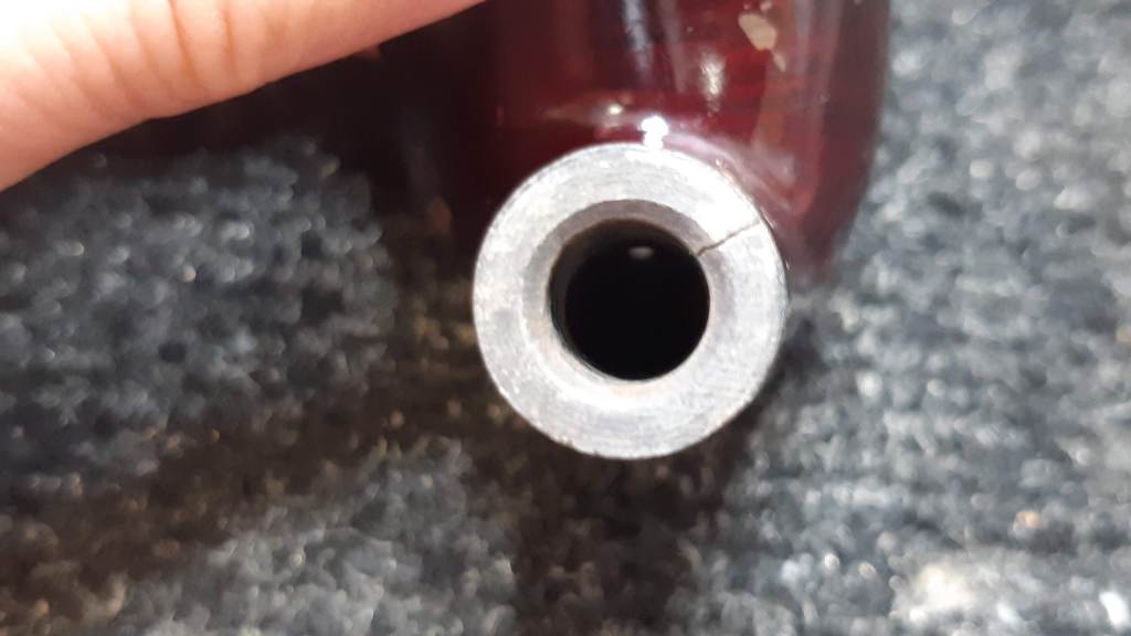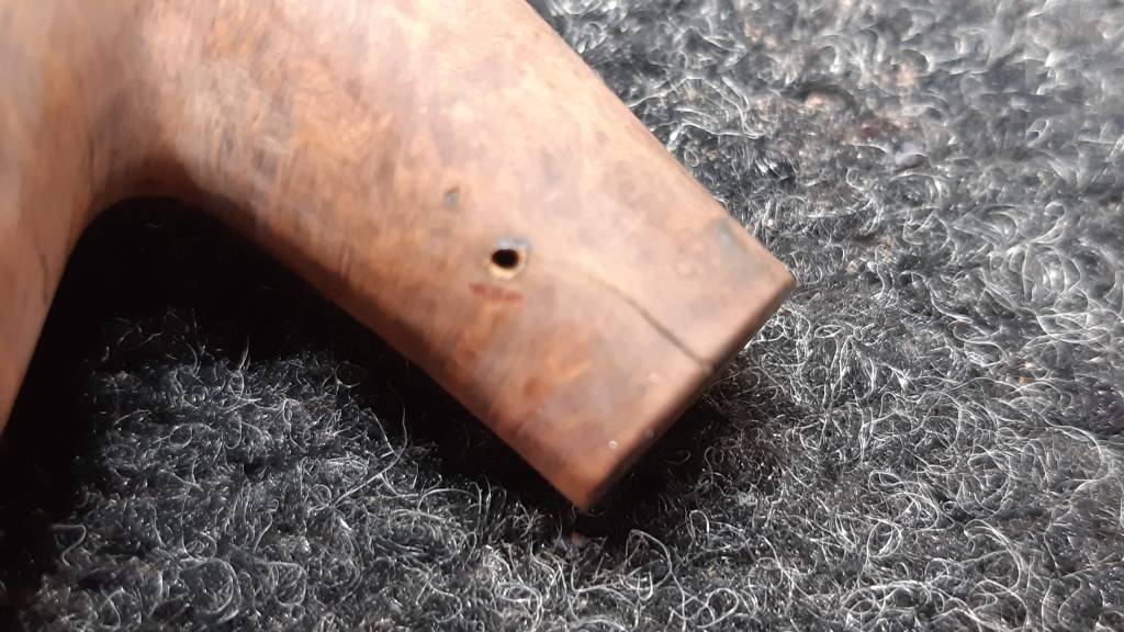 When I removed the stem to check the airway I also discovered a crack in the shank about a centimeter long running down the top right flank. The crack was easily visible once I picked some of the finish away with my thumb nail.