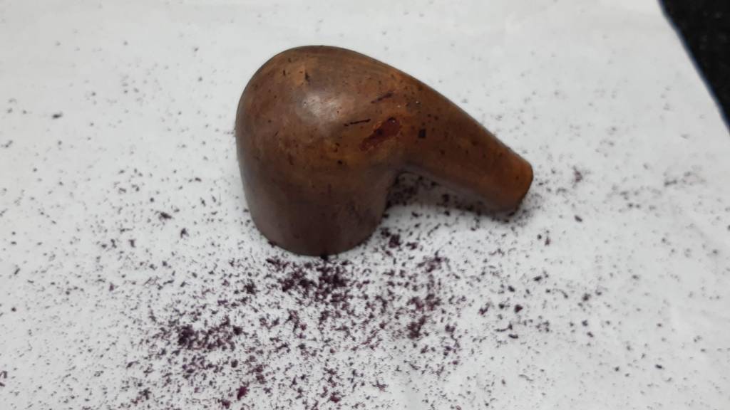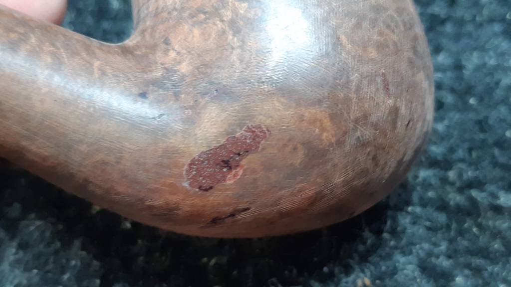 As the coloured lacquer topcoat was coming away so easily, I finished the job that time and disuse had started. The briar underneath had some nice cross-grain on the front of the bowl, but there were also a number of fills, including one large one, that would need to be dealt with during the course of this project.