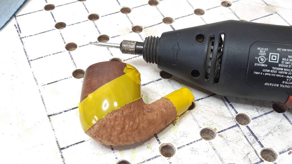 To carve the rustication, I mounted a small round burr in my rotary tool and worked carefully over the briar until I was satisfied with the appearance. It’s not the deepest or chunkiest rustication but roughly equates to a decent sandblasting. I think rustication is a great way to lift the look of “spotty” briar with a lot of fills or occlusions. The fills get blended into the texture and essentially disappear once the pipe is stained.