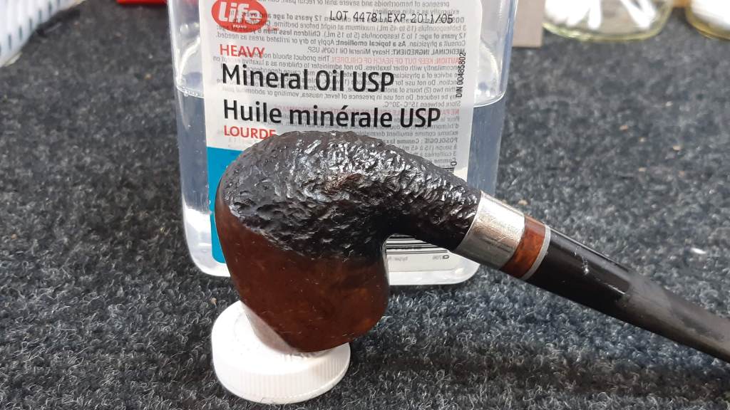 I let the stain dry then removed as much colour as possible from the smooth areas of the stummel, leaving the black only in the grain. When I was happy with the stain coat, I applied mineral oil to the entire stummel to help set the stain and inject a bit of moisture into the old briar.