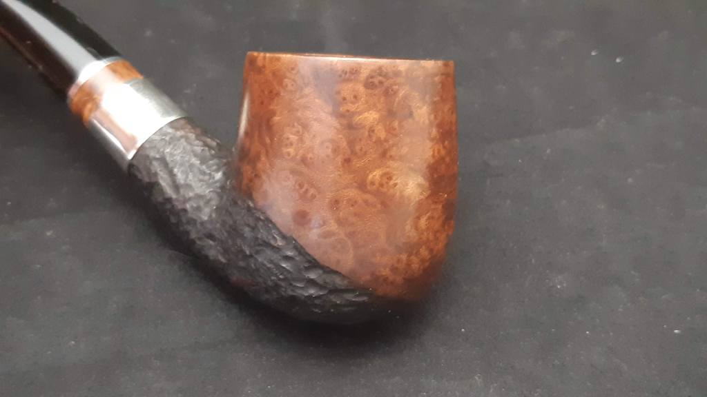 The finished pipe looks great, in my opinion. The lovely cross-grain that was once hidden under a thick lacquer coat is now displayed with pride across the face of the bowl and bits of birds-eye grain pop out here and there on the sides. Gone are the large, unsightly fills, hidden among the hills and valleys of the rustication, and the new stem, complete with briar extension, is a real showstopper.