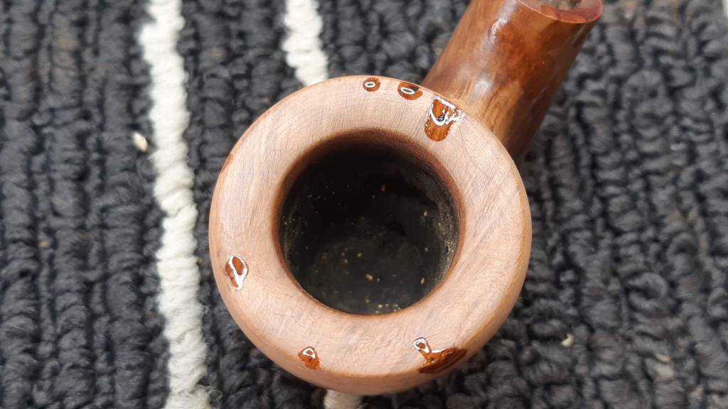 I wiped the pipe down with some alcohol on a cotton pad to remove the worst of the grime, dirt, oil and old wax to both start the cleaning process and get a better look at the state of the pipe underneath the layer of dust. I took some close-up photos of the rim damage to show what I needed to correct.