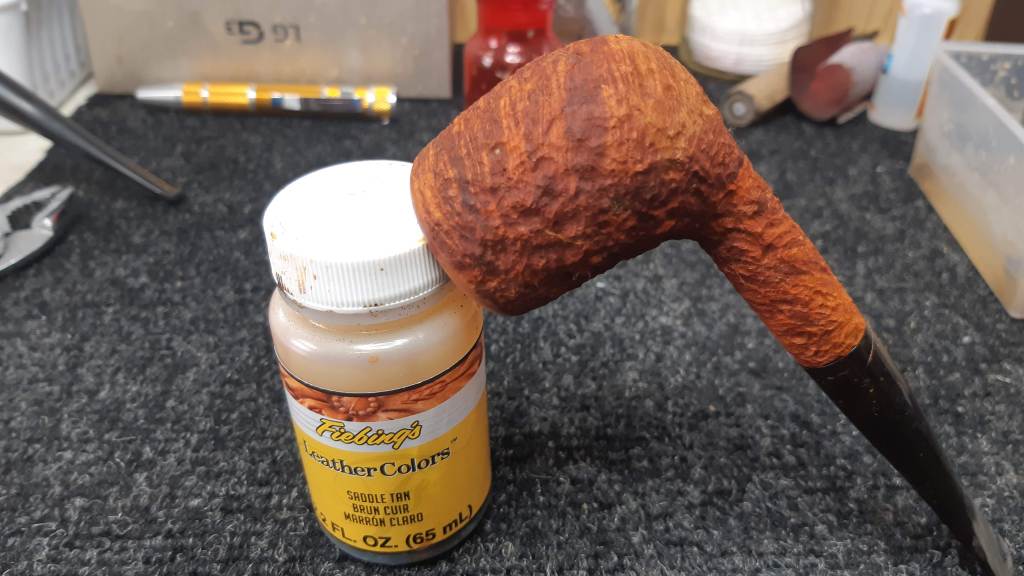 You can see the results of my efforts in this pic, which also shows the first coat of stain going onto the briar. I went for a classic black over red finish. The red stain will show on the smooth rim and also peek out from the tops of the rustication after final buffing.