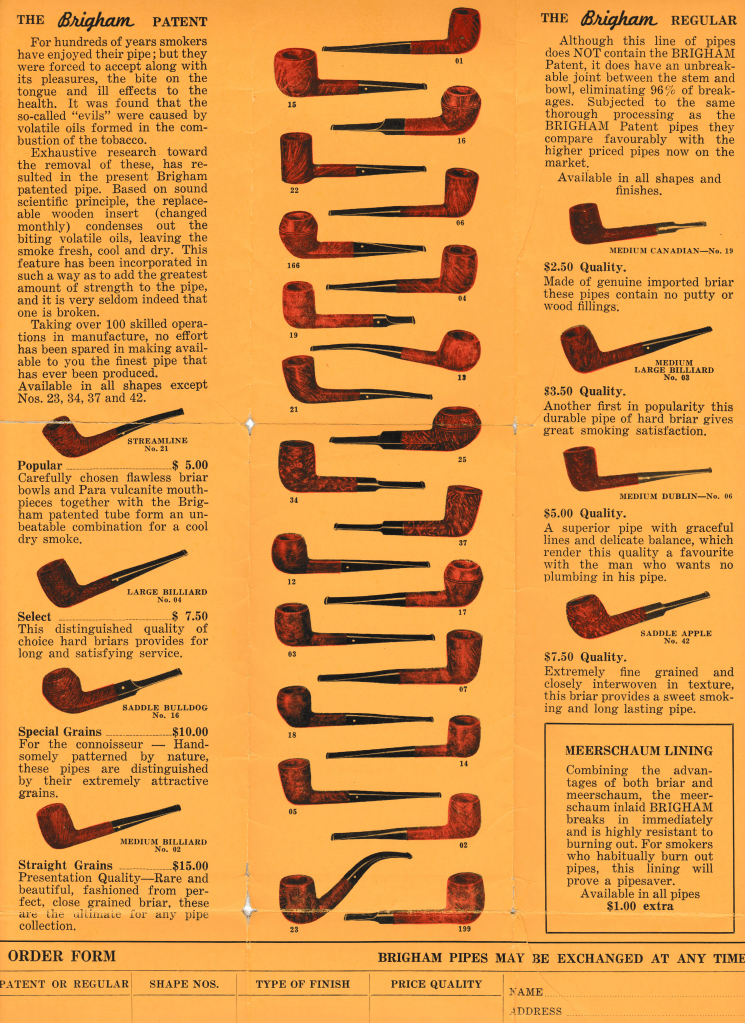 I’m switching things up this week. Instead of a pipe restoration, I thought you might enjoy a sneak peek at some content from the Brigham pipes book. In this blog, we’re going to take a closer look at Brigham Patent Era pipes, those made between 1938 and 1955.