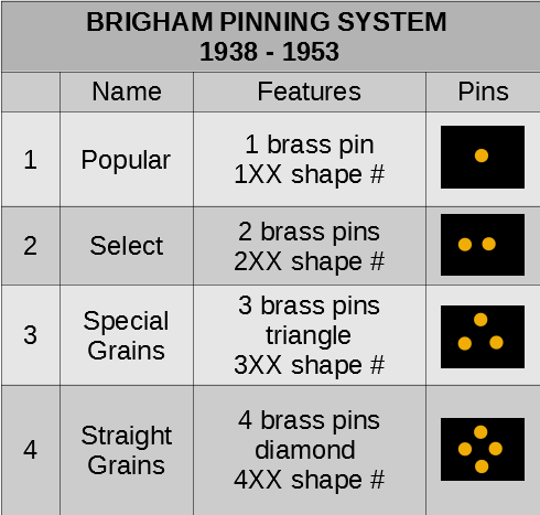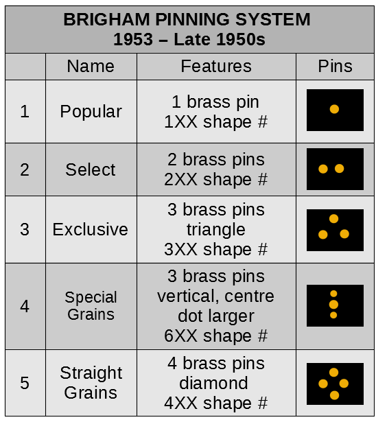 When the product line expanded to five grades in about 1953, the Exclusive grade was inserted between the Select and Special Grains grades and assumed the triangular three-Dot pinning pattern. The Special Grains grade was given a new pinning consisting of three Dots in a vertical line. The middle Dot is 1/16” in diameter (the same size used for previous pinning patterns), while the top and bottom Dots are slightly smaller at 3/32”.