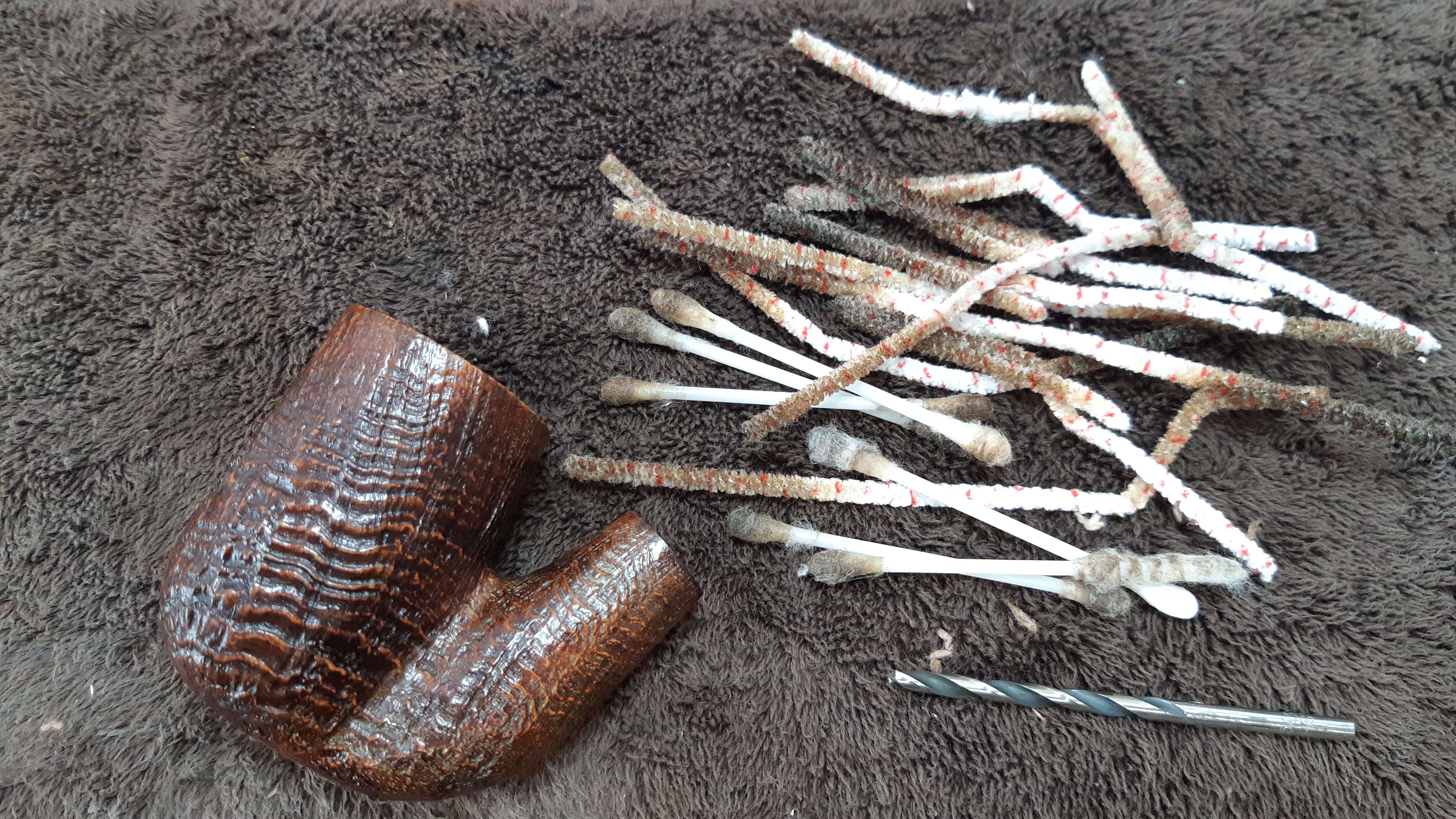 I used more pipe cleaners and alcohol along with a few cotton swabs on the stummel’s shank and airway. As is usual for Oom Paul and other pipe shapes with a significant bend, there was a fair bit of muck built up in there. I used the 5/32″ drill bit you can see in the pic to clear out the worst of the tars from the airway and let pipe cleaners dipped in alcohol do the rest.