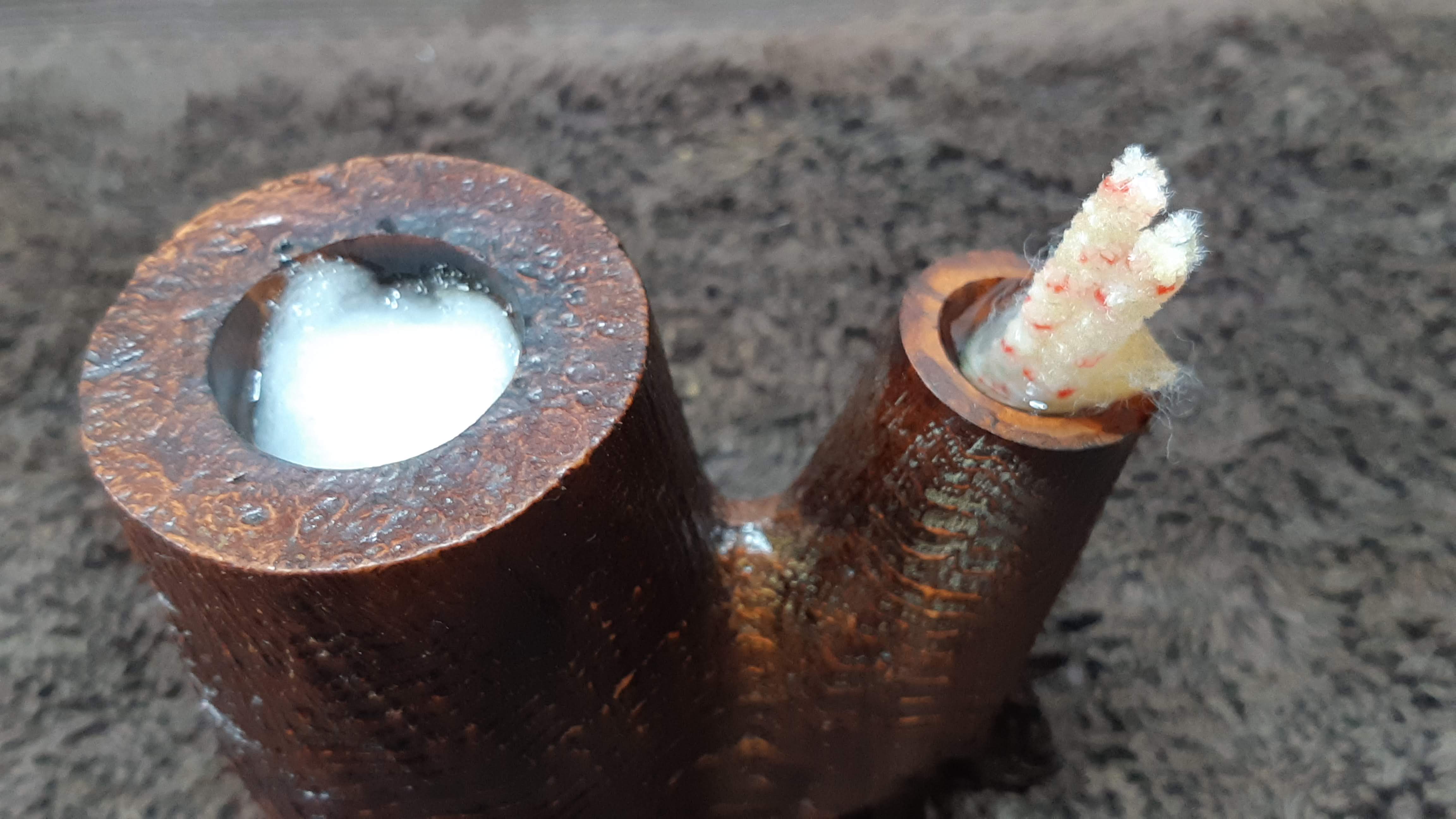 Just before closing things down for the night, I set the stummel up with an alcohol treatment to dissolve and remove any tars that the pipe cleaners had missed. For this I packed the pipe’s chamber with cotton balls, slipped a pipe cleaner down the airway and twisted another cotton ball into the mortise before filling the chamber with isopropyl alcohol. I have found that adding the pipe cleaner in the shank helps quite a bit with deeply bent pipes. I kept adding alcohol until the protruding end of the pipe cleaner in the shank showed wet, then set the pipe aside for the night.