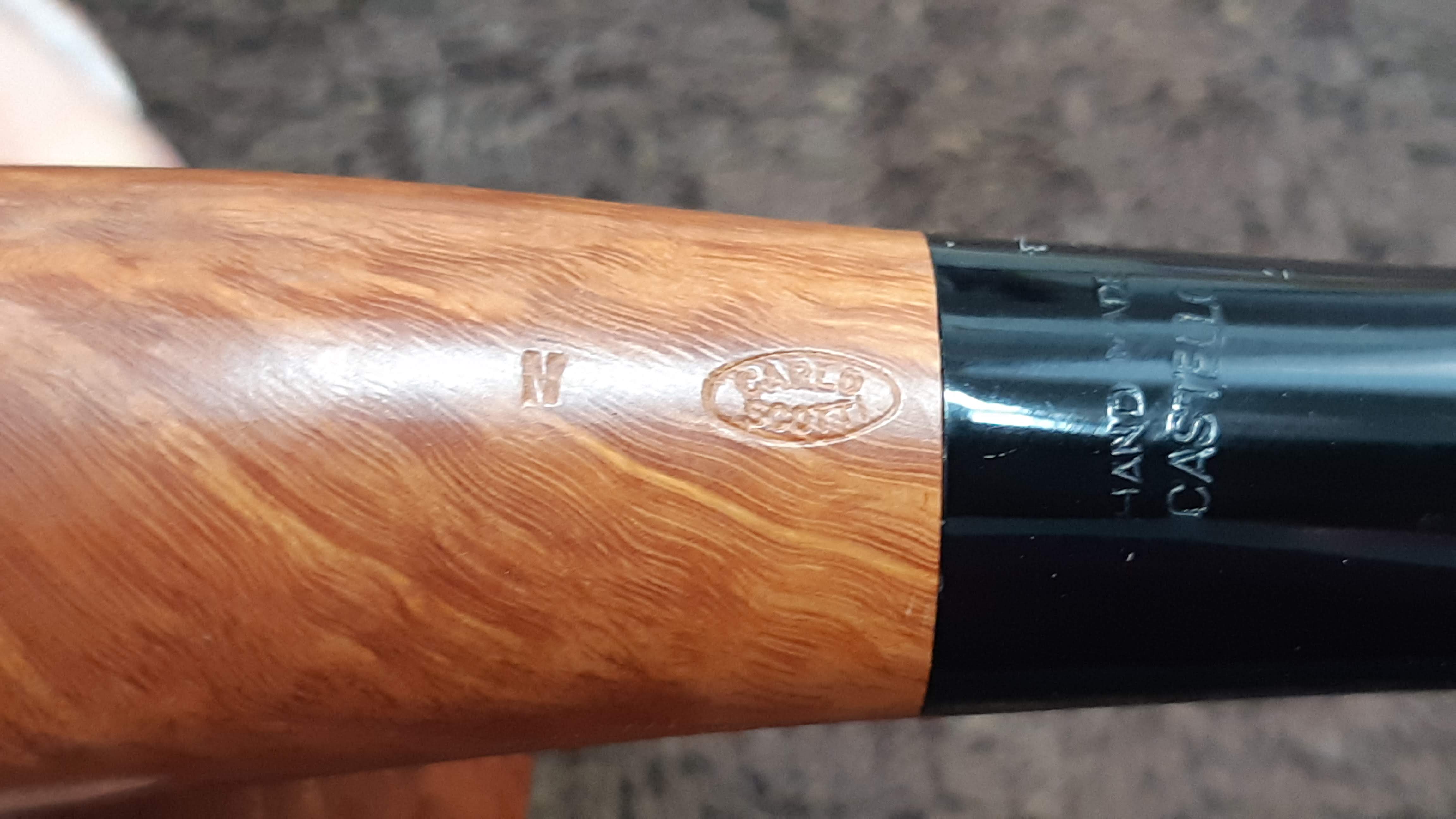 The pipe is stamped “Castello” over “‘Castello'” and “G” on the left shank, and “Made in Cantu” over “Italy” on the right. The bottom of the shank carries two more stamps, a capital “N” and “Carlo” over “Scotti” in an oval. The stem is marked “Handmade” over “Castello” on the bottom, and is inset with the Castello White Bar logo on top.