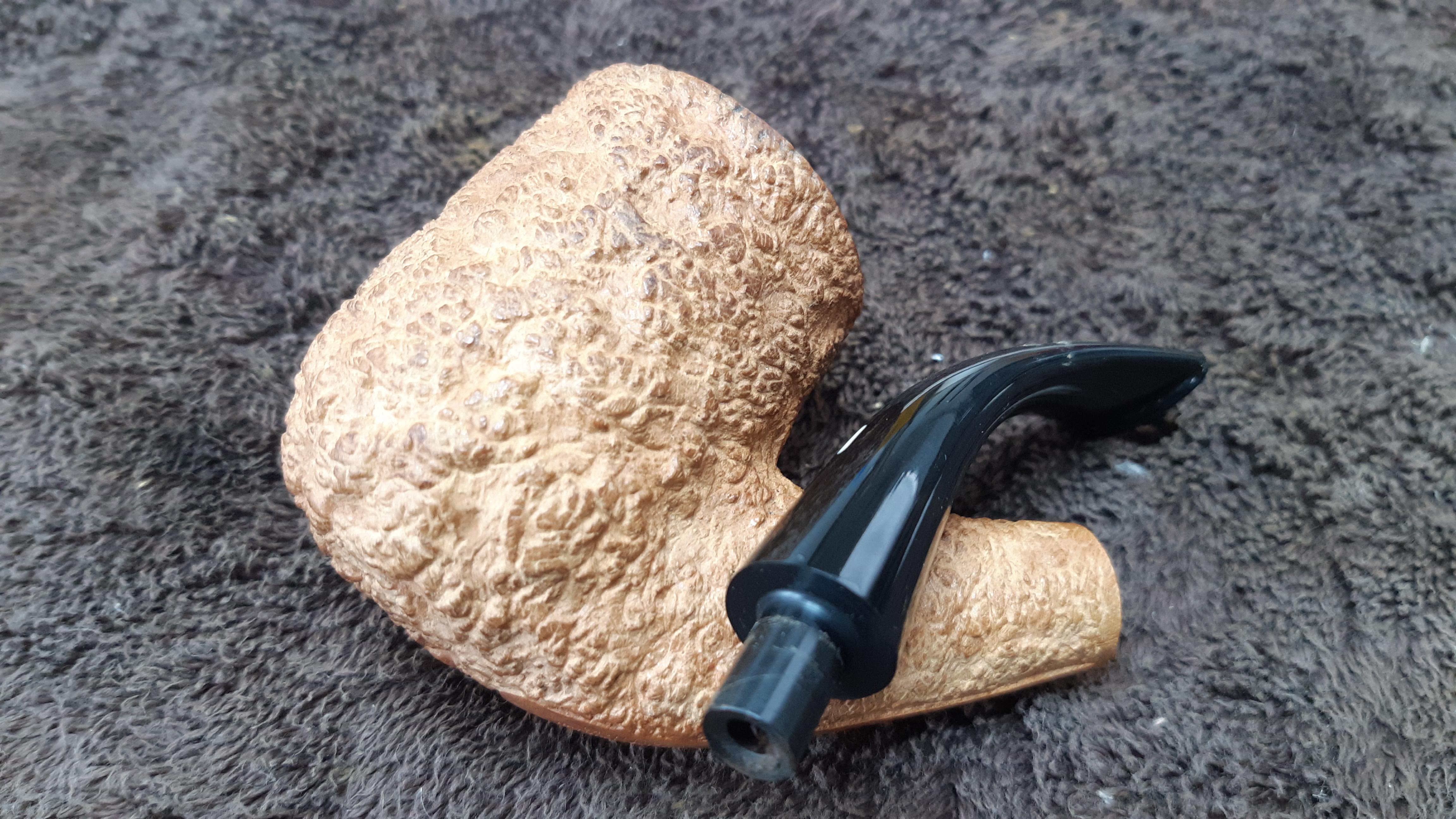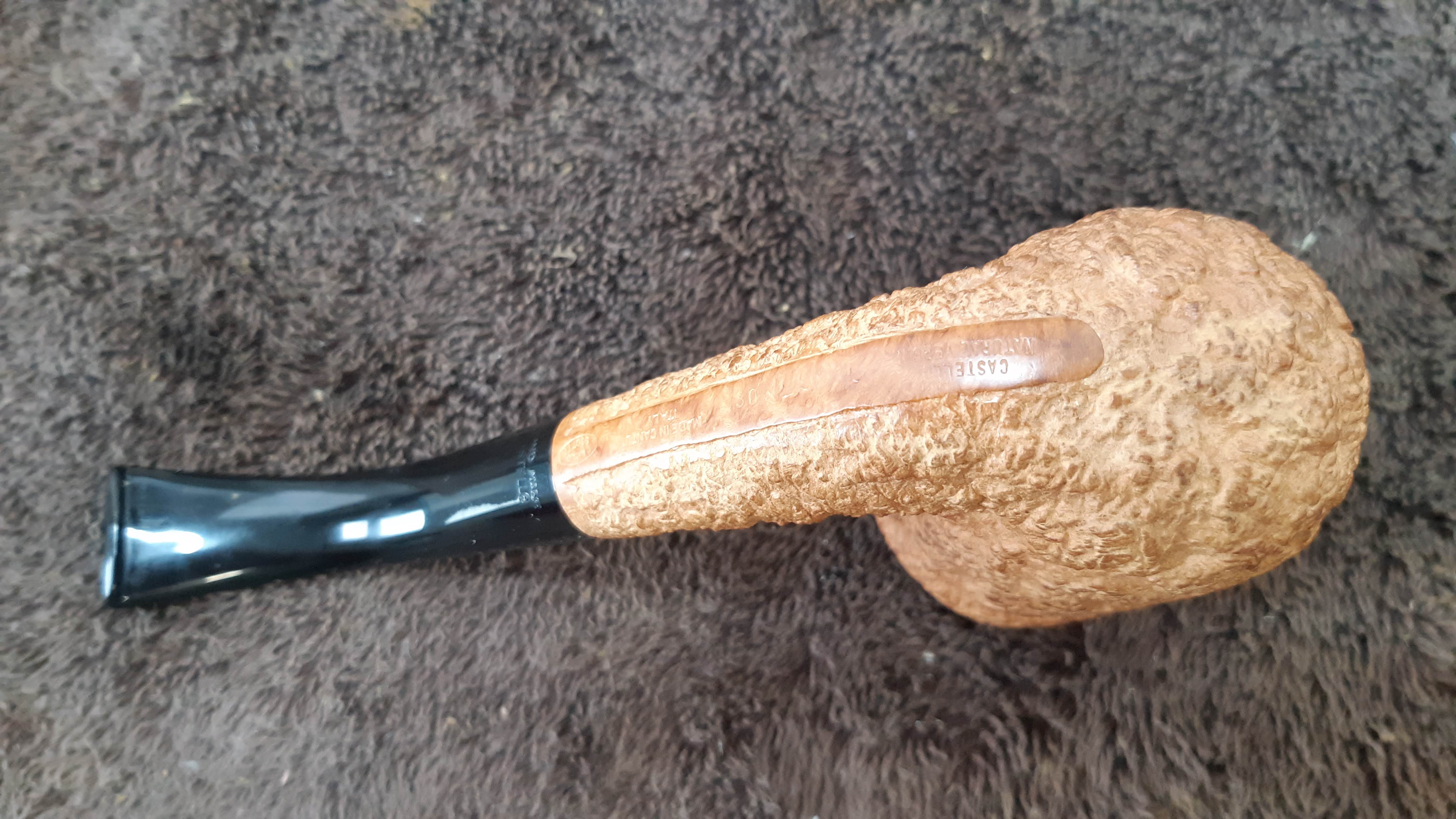 As a reminder, Castello pipes are all hand made in Italy by the pipemaking firm established in the late 1940s by Carlo Scotti and now run by his son-in-law, Franco “Kino” Coppo and daughter Savina Scotti. Pipes are sized by letter grades (K, KK, KKK, KKKK, G & GG, in ascending order) and are available in several lines of rusticated, sandblasted and smooth finishes. At the top of the rusticated pipe grades is the “Natural Vergin” line, an example of which is on the worktable today.