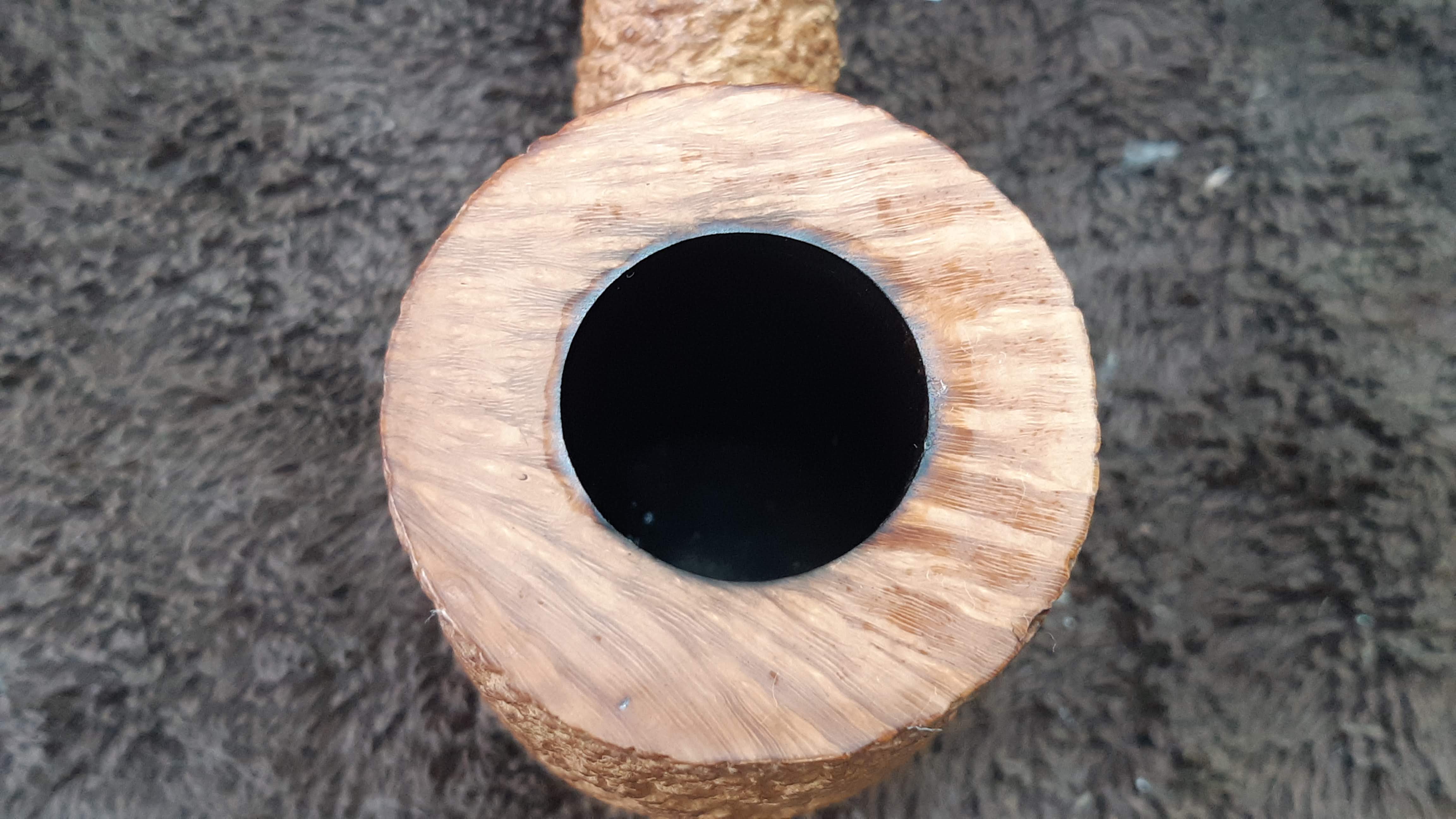 The finished pipe is a real fistful of briar. This G-sized Bent Billiard tips the scales at 2.8 ounces and measures 6 inches from the bottom of the bowl to the end of the stem. The bowl itself stands 2-1/4 inches tall and 1-1/2 inches wide. The chamber bore is 7/8 inches in diameter and just shy of 2 inches deep. The chamber walls are a solid 3/8 inch wide, and the smooth rim displays some very nice cross-grain.