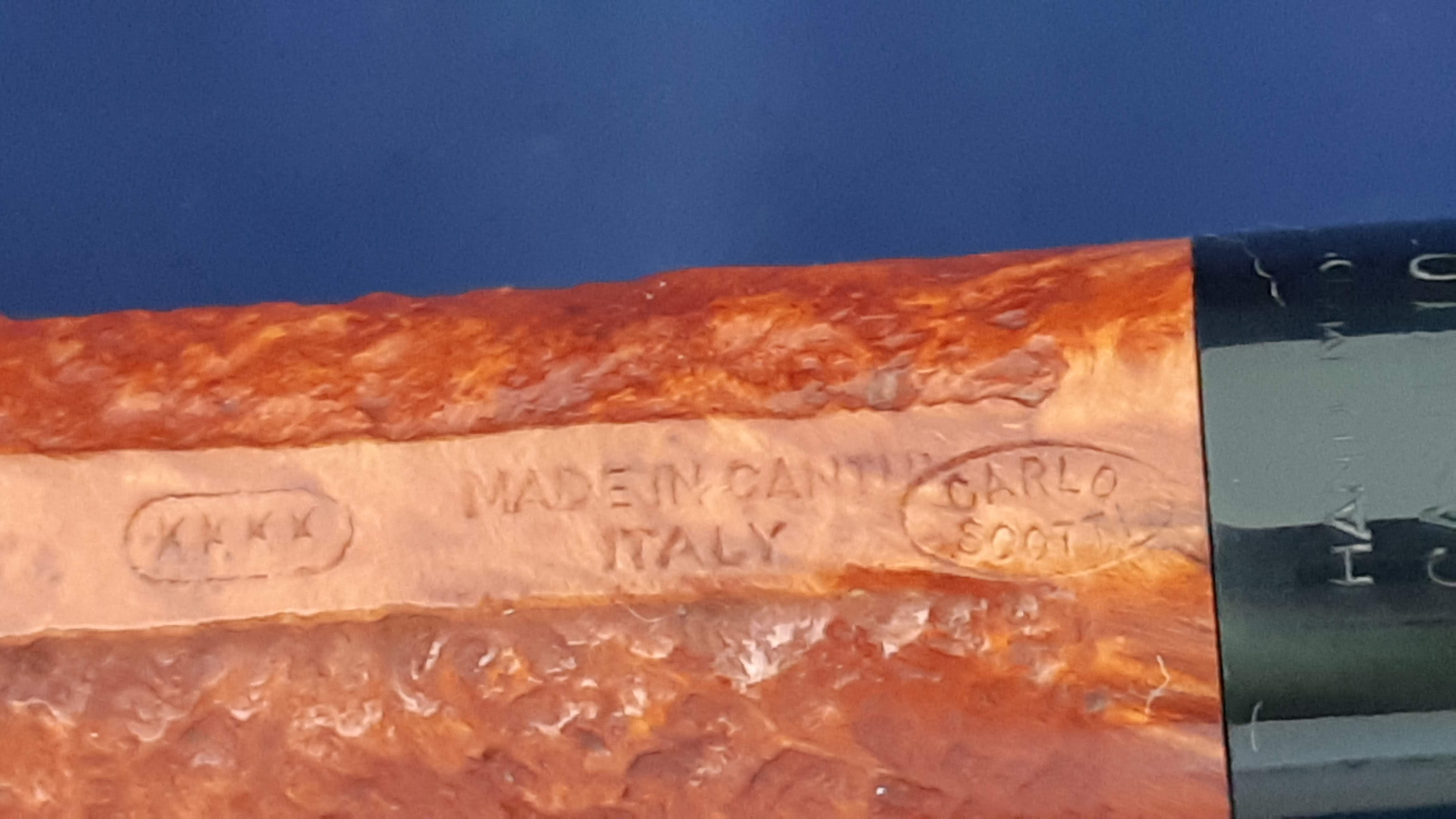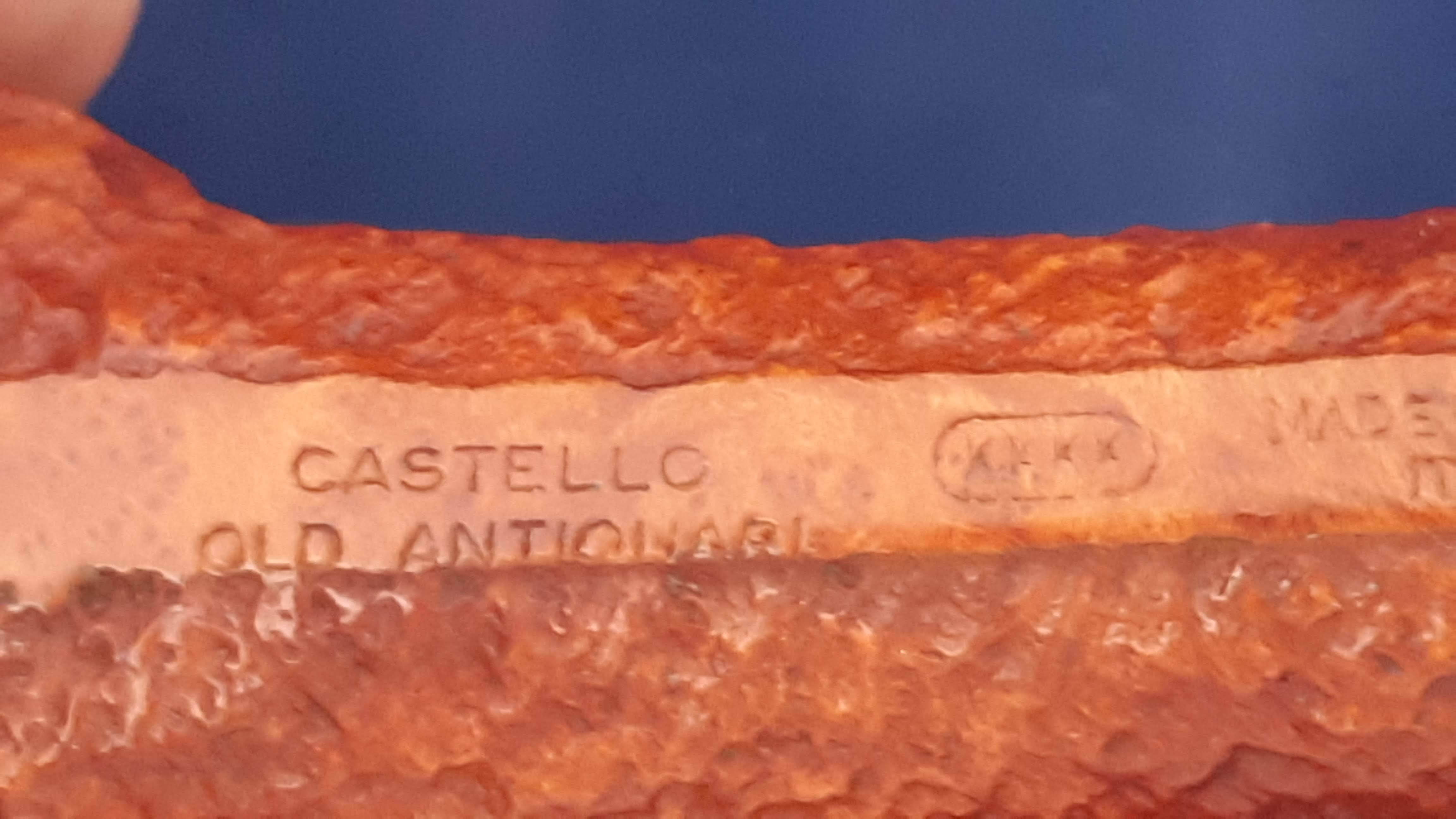The underside of the pipe is stamped “Castello” over “Old Antiquari” follwed by “KKKK” in an oval then ‘Made in cantu” over “Italy” and finally “Carlo Scotti” in an oval. The stem is marked “Hand Made” over “Castello” and carries the White Bar logo on top.