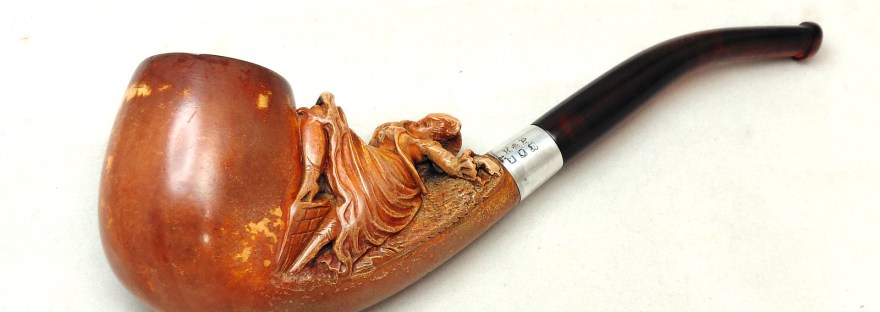 Fortunately, there are modern alternatives to genuine Amber pipe stems, which is great news for the pipe on the bench this week. This intricately carved K&P meerschaum stummel features what appears to be a Victorian dancing girl reclining in the crook between bowl and shank. A Sterling Silver band shores up a delicate shank with the original bone screw tenon still intact. The original Amber stem, however, is long gone.